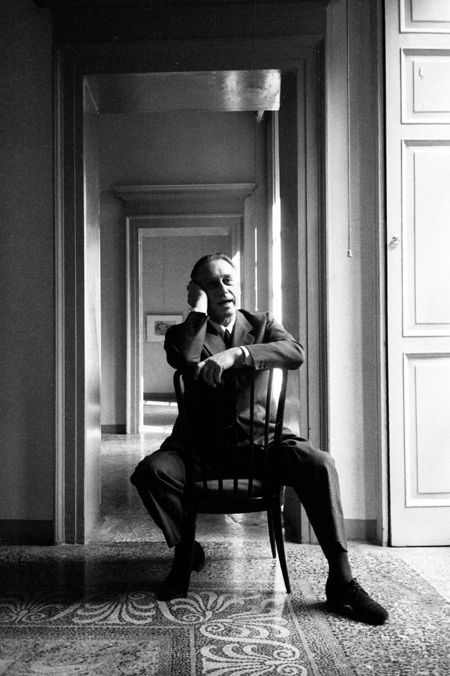 Black and white photograph, full-length portrait of a gray-haired man in a dark suit seated on a wooden chair in a doorway, a long corridor receding behind him