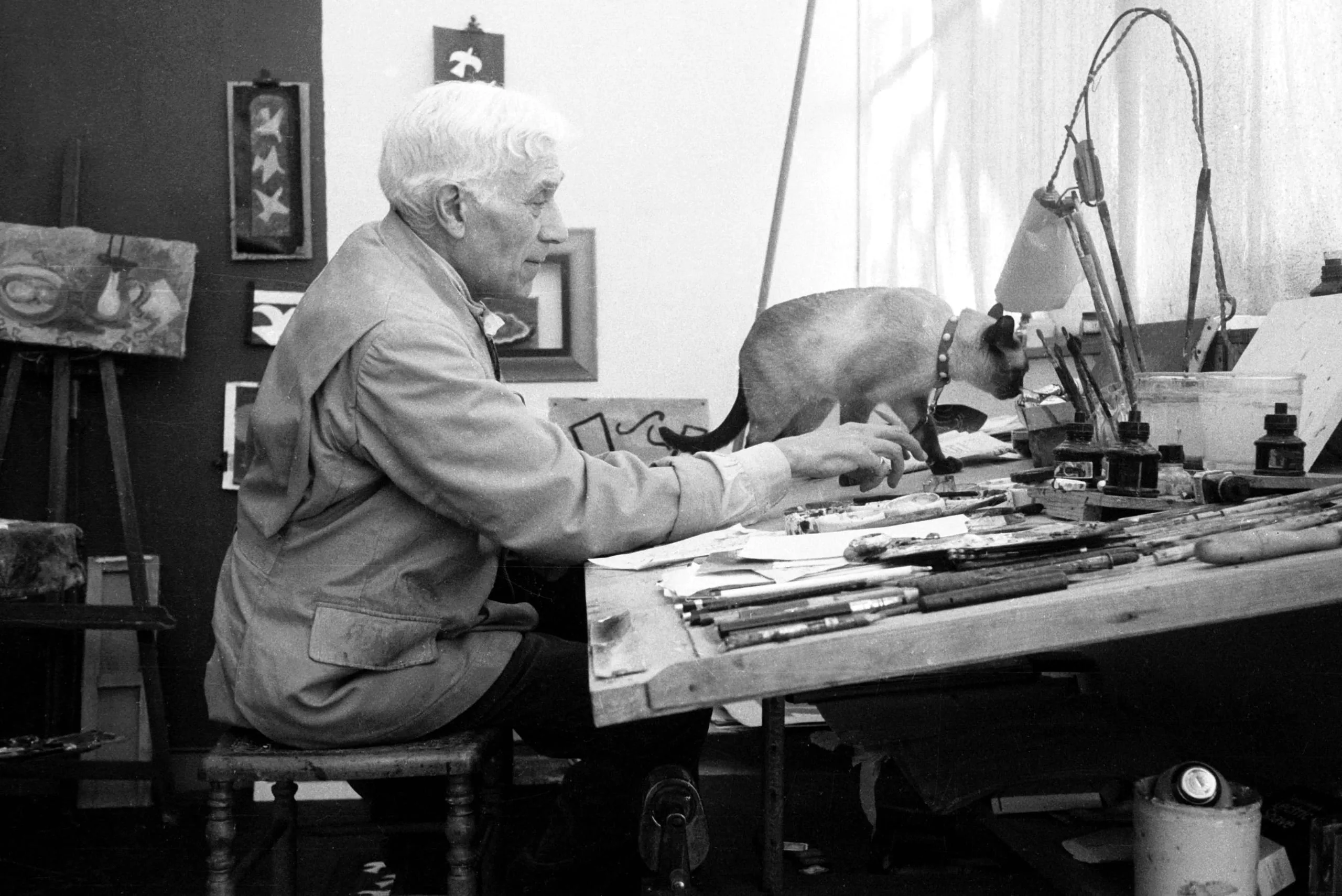 Black and white photograph of an elderly man in profile, seated at a tool-covered work table in an artist's studio, reaching toward a cat