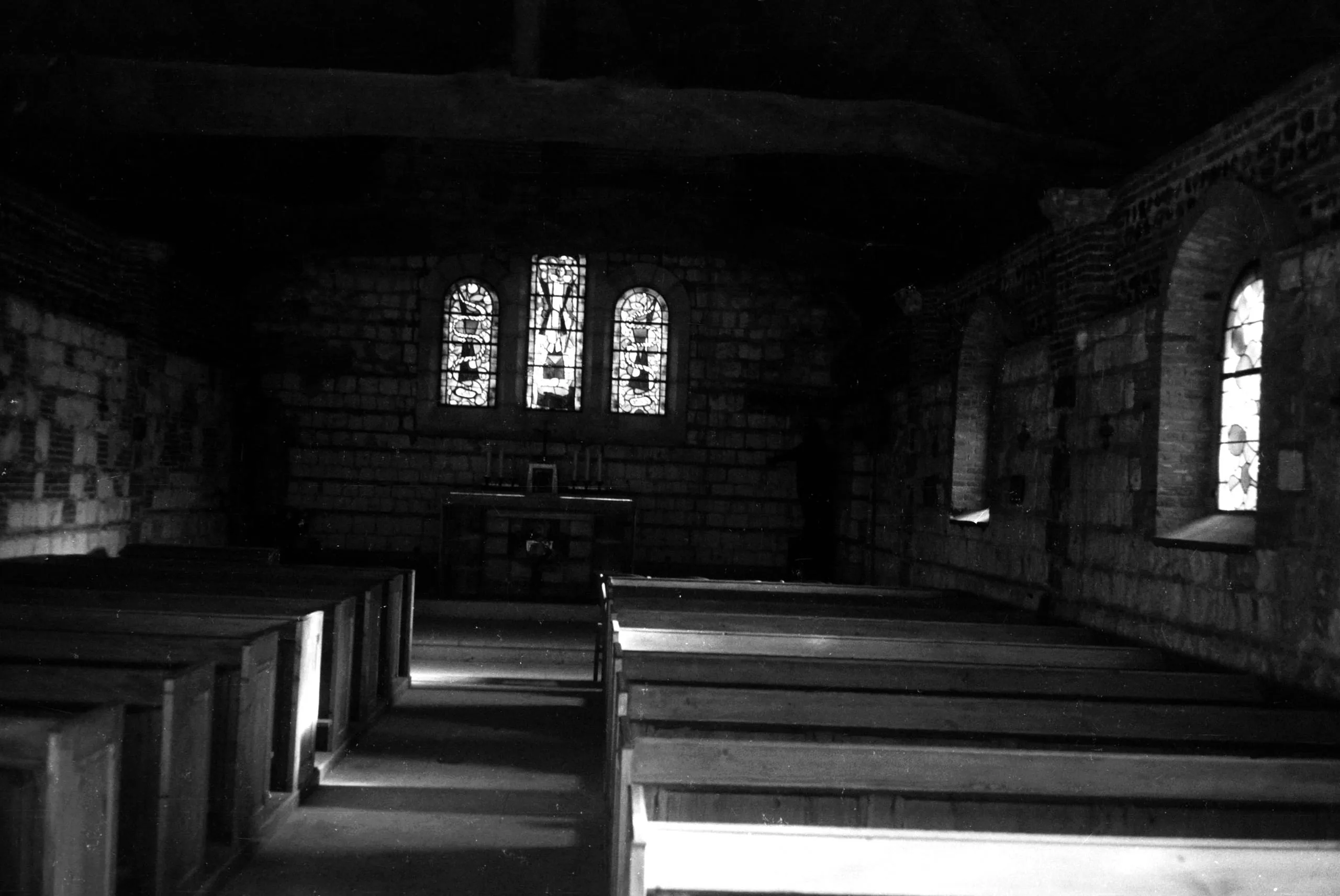 Black and white photograph of a small stone church interior, looking toward the altar and three backlit stained glass windows, with rows of wooden pews on either side of the aisle