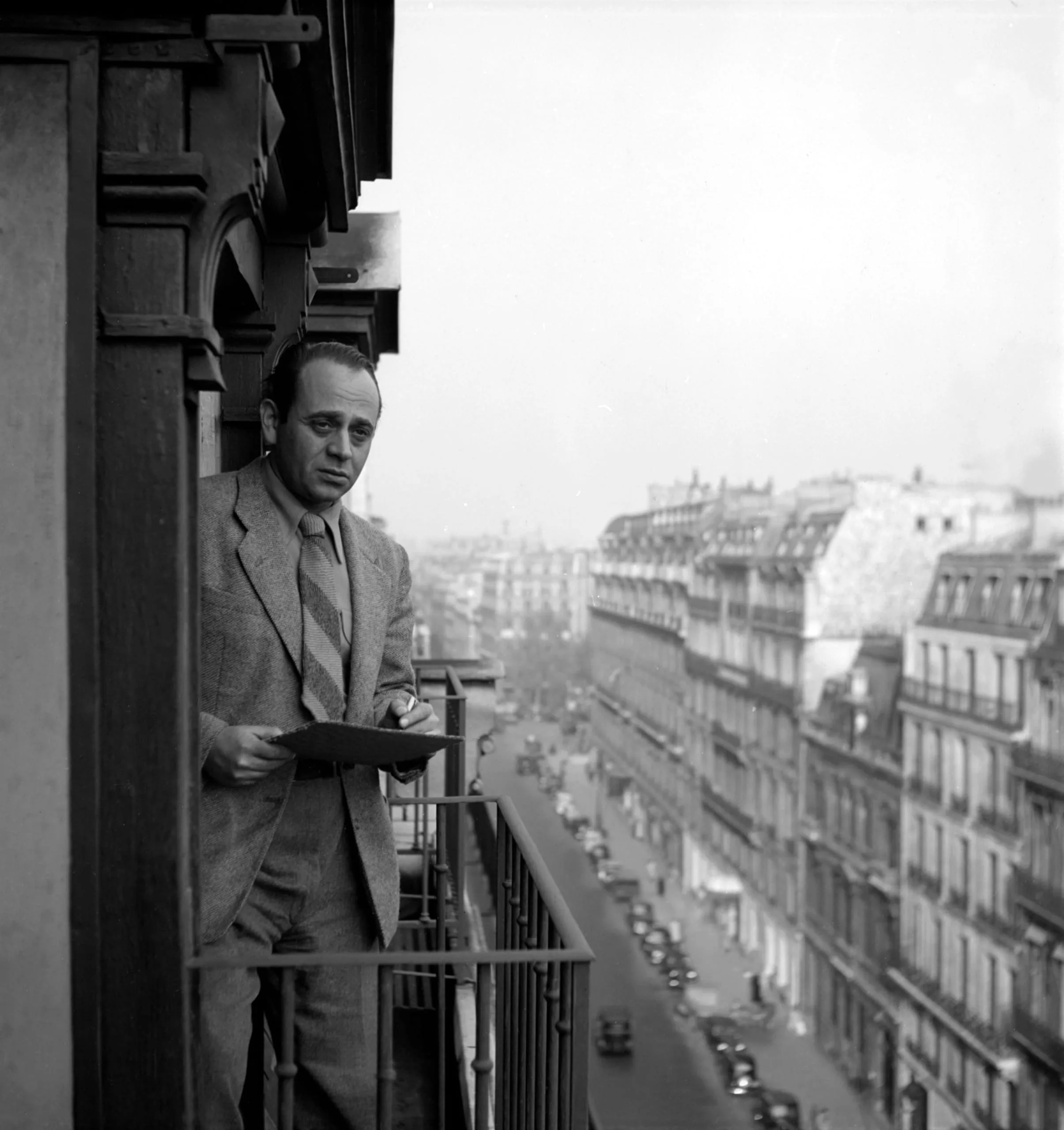 Black and white photograph of a man in a tweed blazer and striped tie leaning on a balcony railing above a broad Parisian boulevard