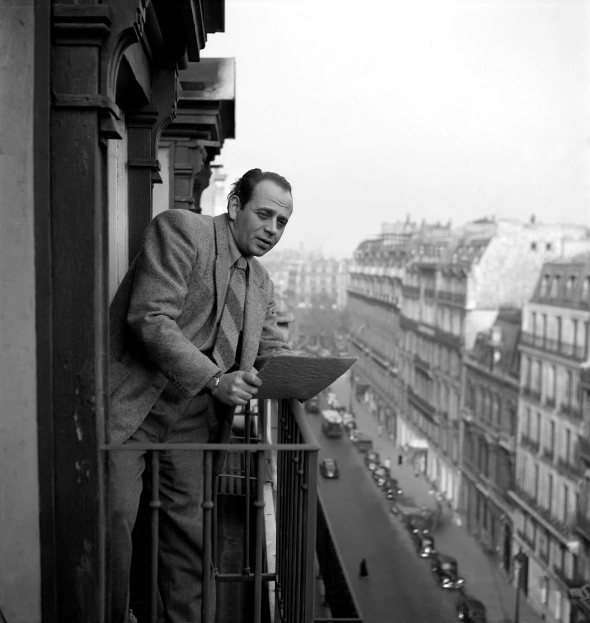 Black and white photograph of a man in a blazer and tie leaning over a wrought-iron balcony railing, looking down at a long city street lined with tall stone buildings