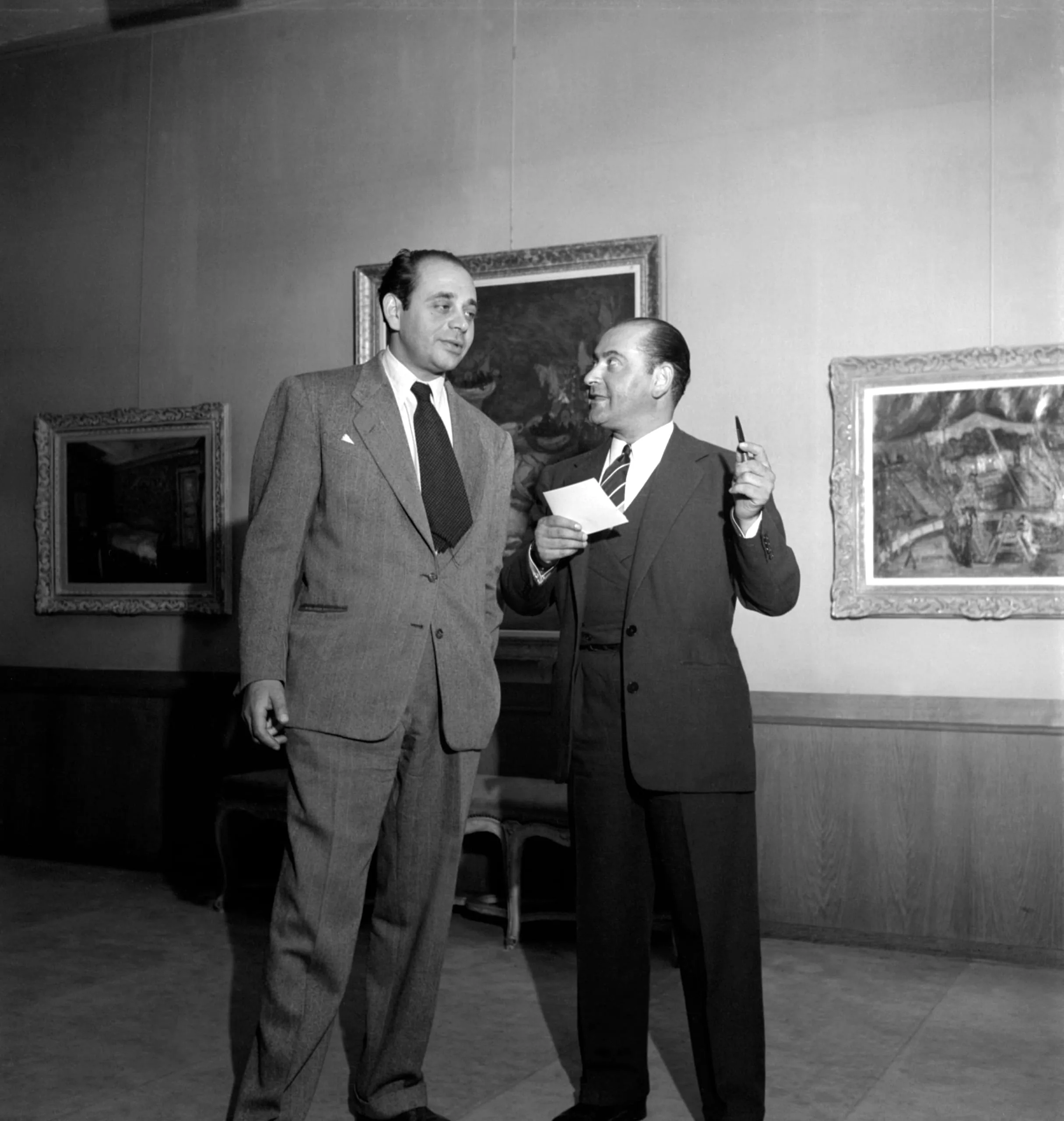 Black and white photograph of two men in suits standing in a gallery, one holding a card and raising a pen, paintings visible on the wall behind them