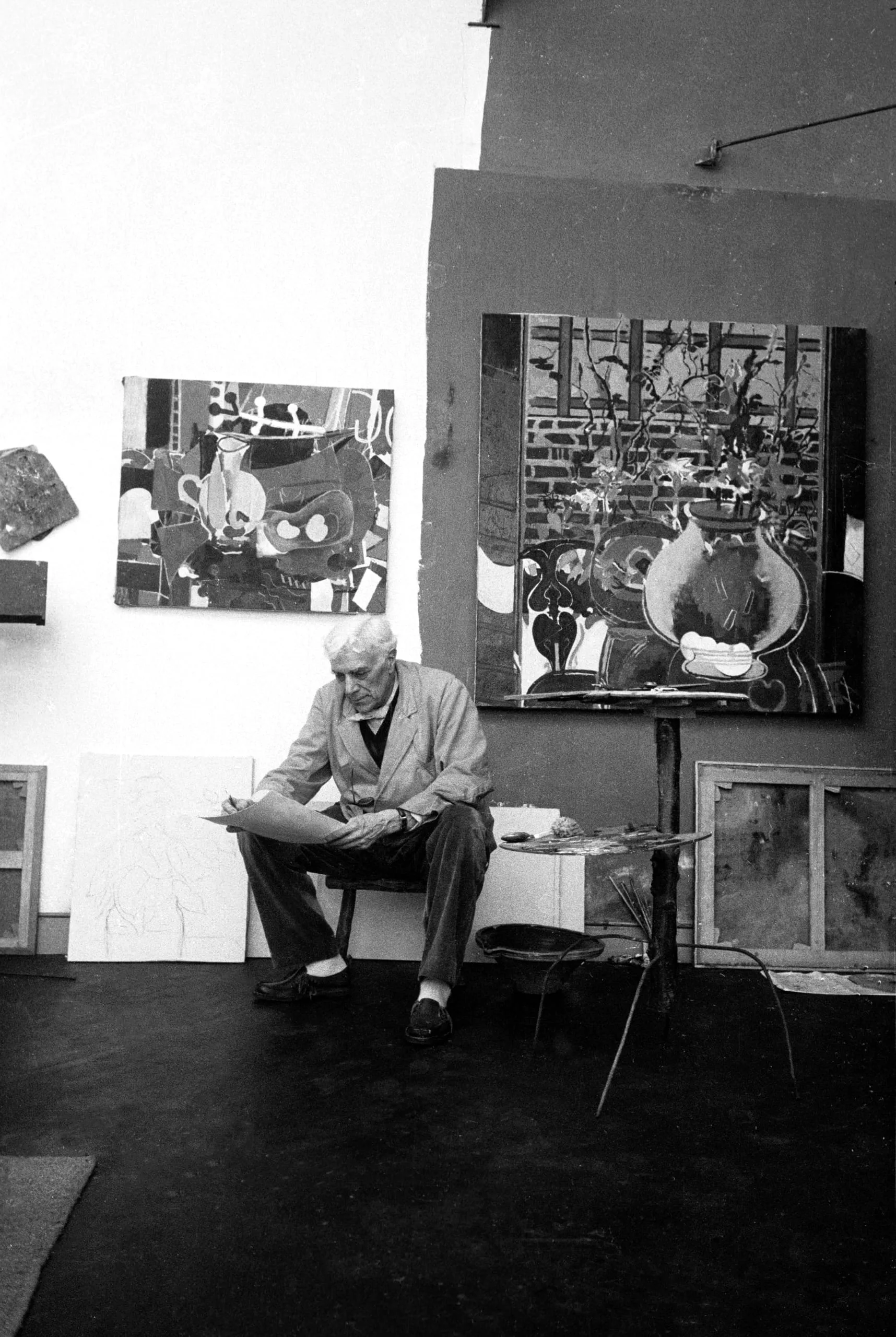 Black and white photograph of an older white-haired man seated on a stool in a studio, surrounded by large gestural paintings and stretched canvases