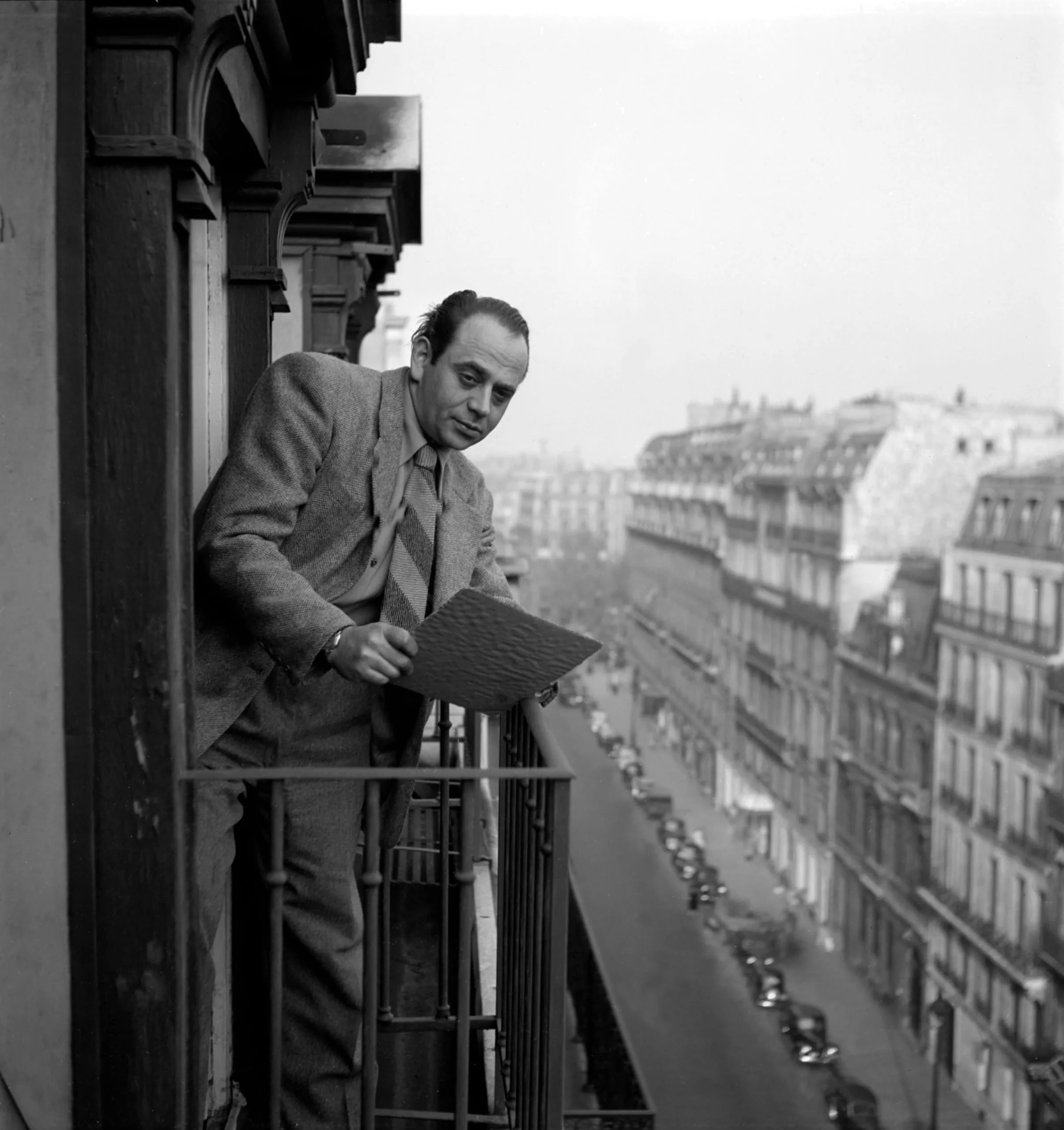 Black and white photograph of a man in a tweed jacket leaning on a narrow iron balcony, looking down over a wide Parisian boulevard lined with Haussmann buildings