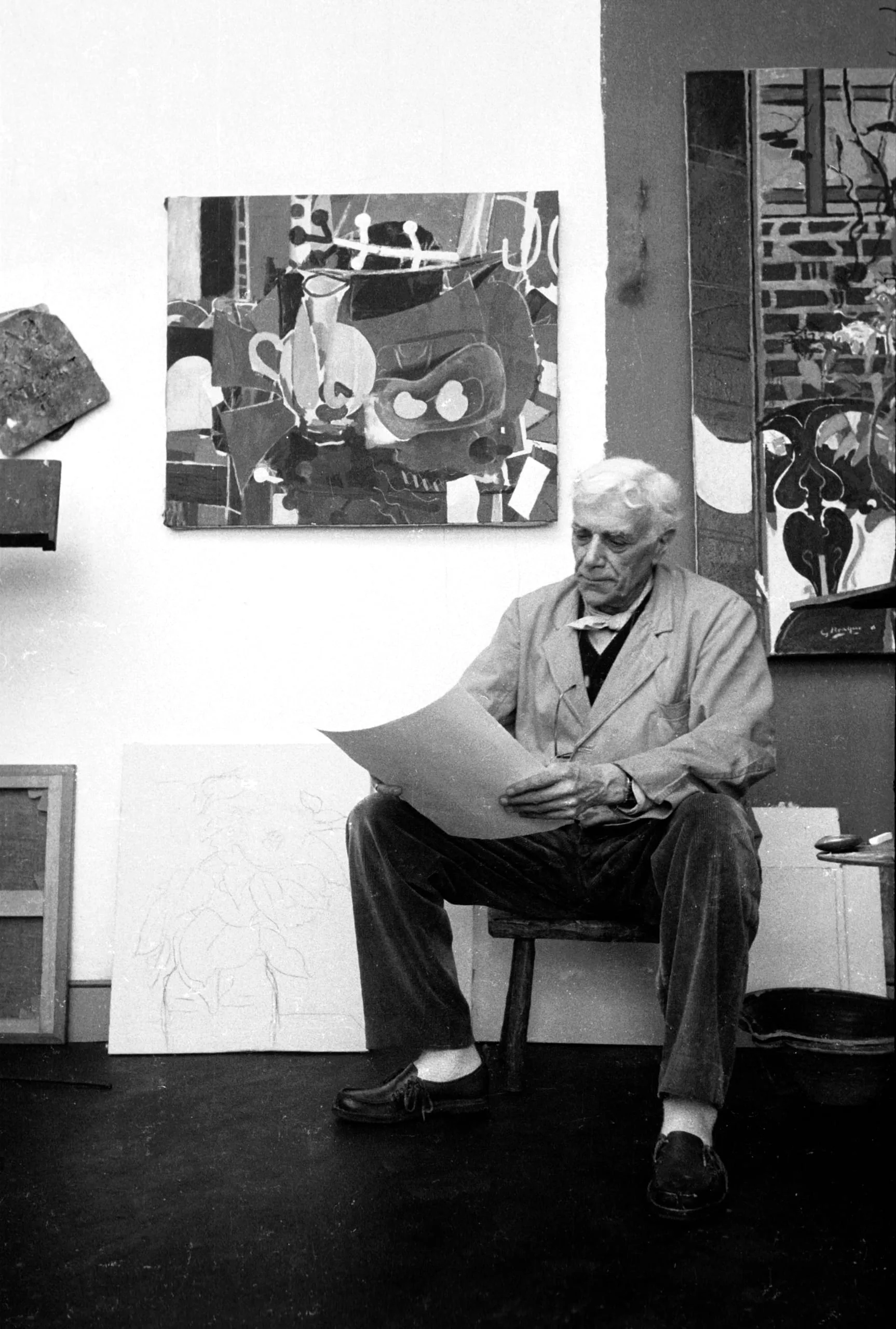 Black and white photograph of an elderly man seated in an art studio, examining a large sheet of paper, surrounded by paintings and sketches