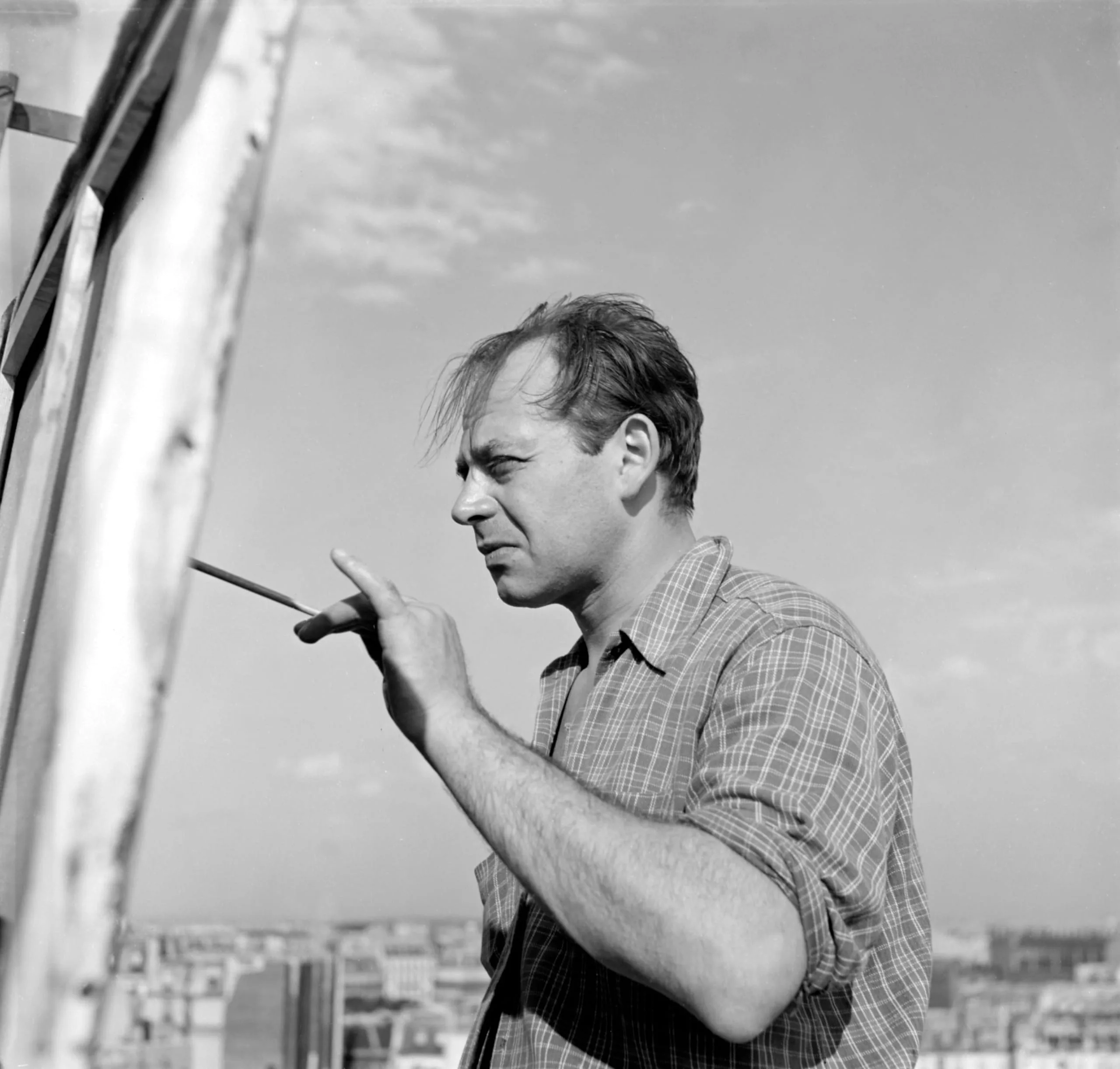 Black and white photograph of a man in a plaid shirt leaning toward a canvas on an easel, holding a paintbrush, with a city skyline visible behind him