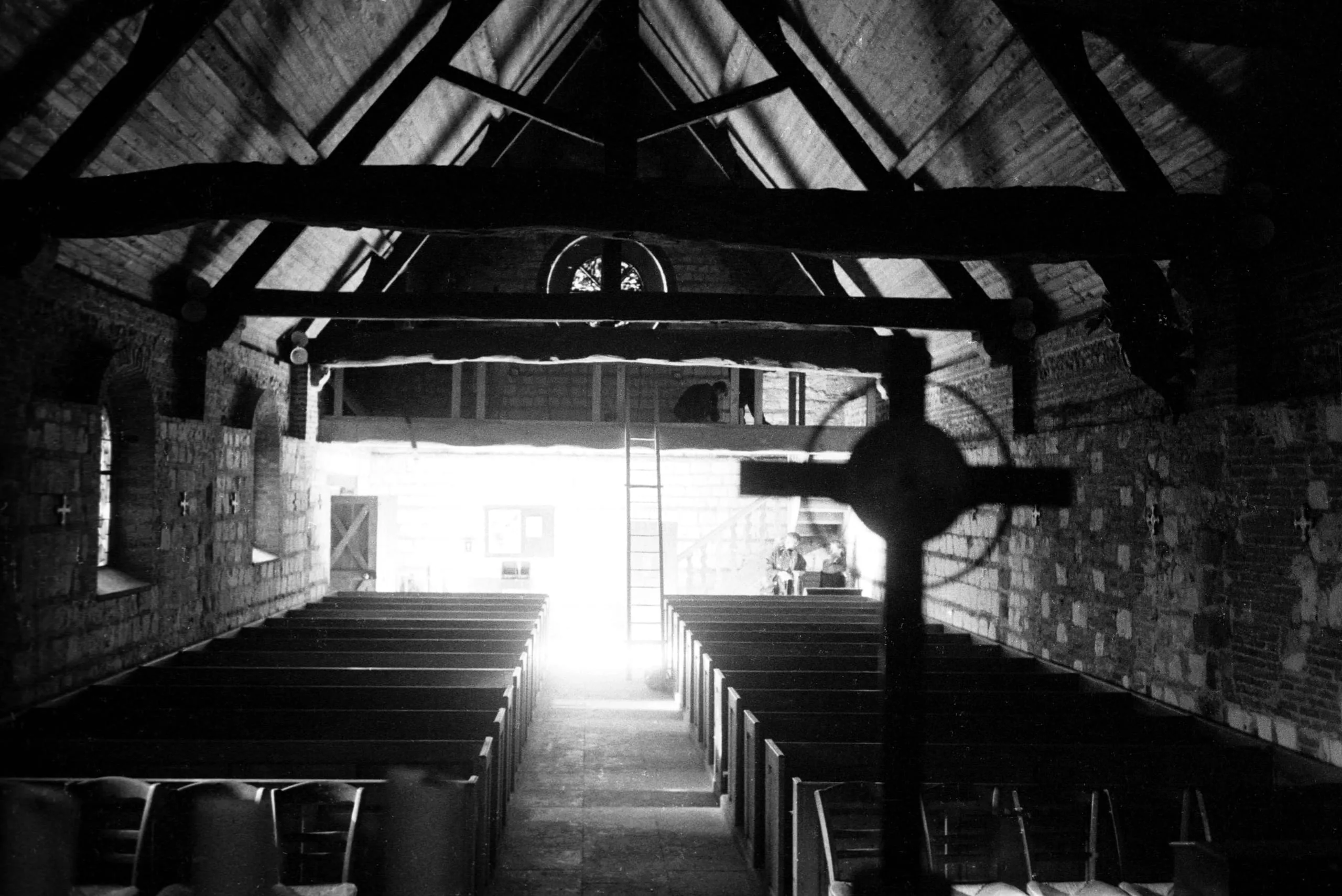 Black and white photograph of a stone church interior looking toward open doors, with wooden pews, exposed timber roof, and a Celtic cross silhouetted against bright backlight