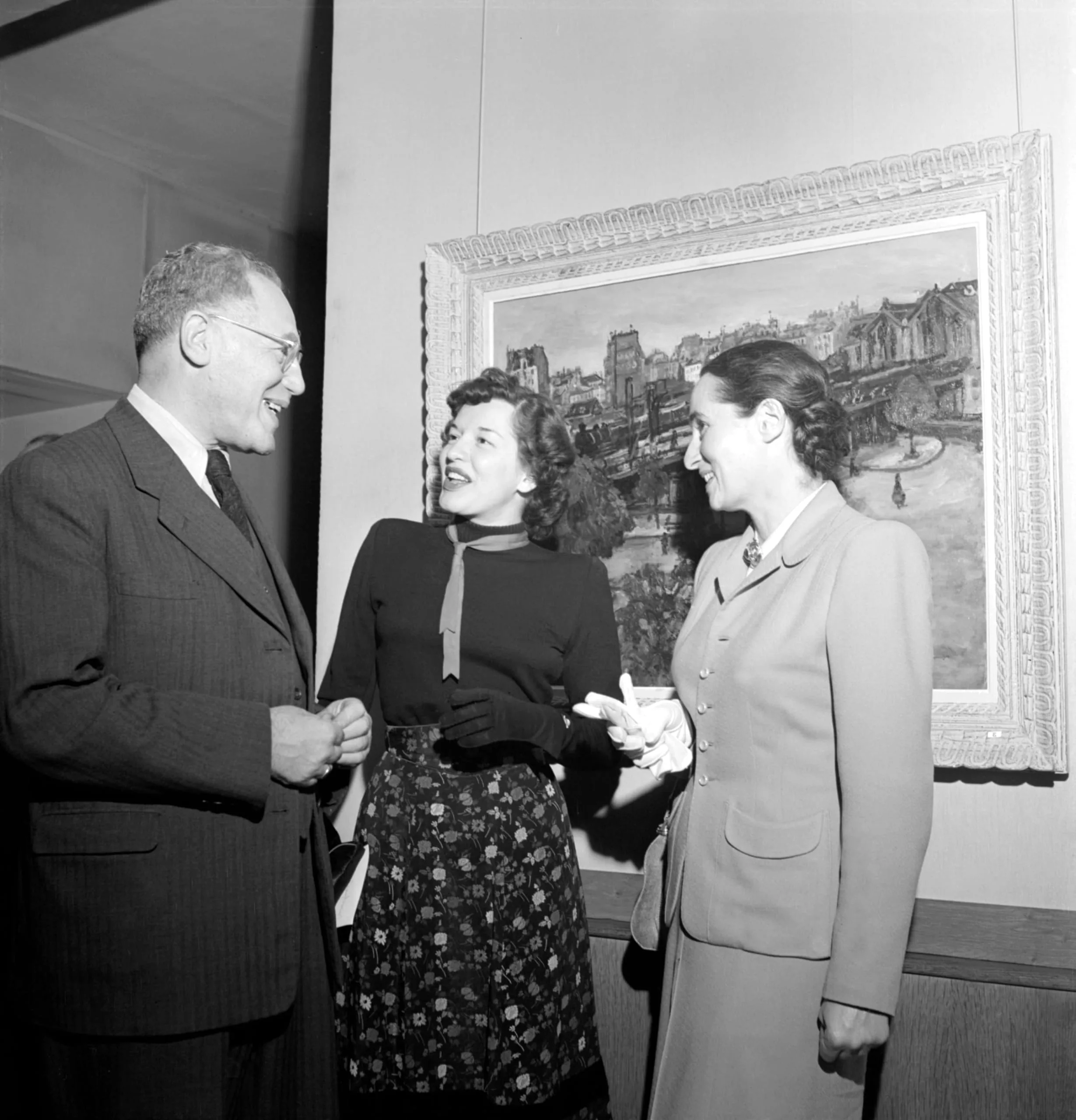 Black and white photograph of two women and a man standing together in a gallery, smiling, with a framed landscape painting on the wall behind them