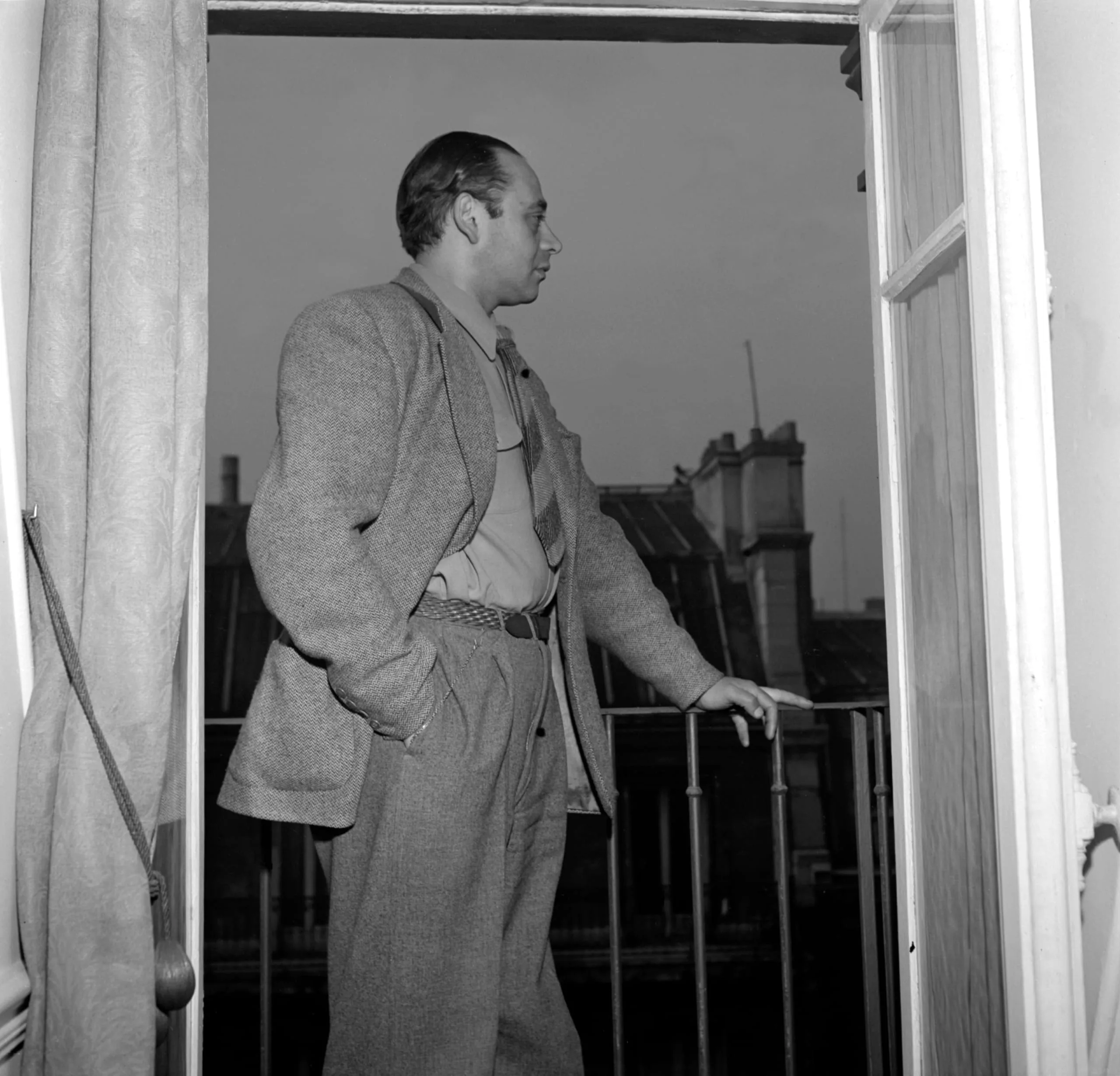 Black and white photograph of a man in a tweed jacket and pleated trousers standing in an open French window, viewed in profile, holding a cigarette over a balcony railing with rooftops behind him