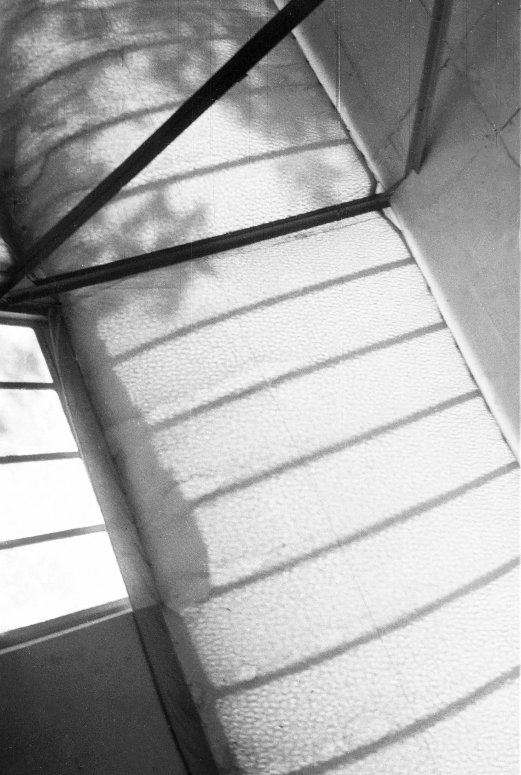 Black and white photograph of a textured interior wall corner with parallel shadows cast by window bars and a diagonal dark pipe overhead