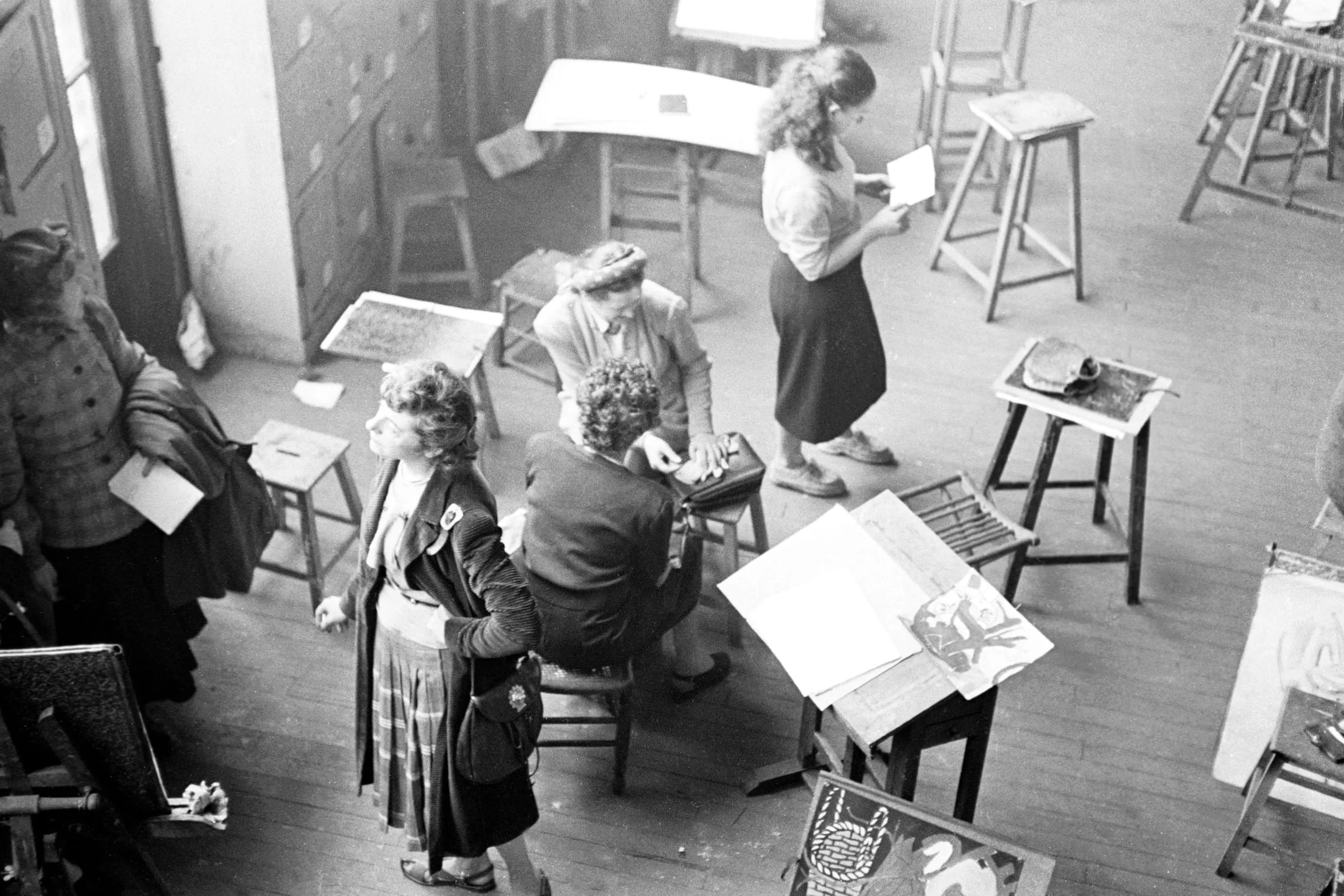 Black and white photograph shot from above, showing four women in an art studio with wooden stools, drawings on the floor, and an open sketchbook
