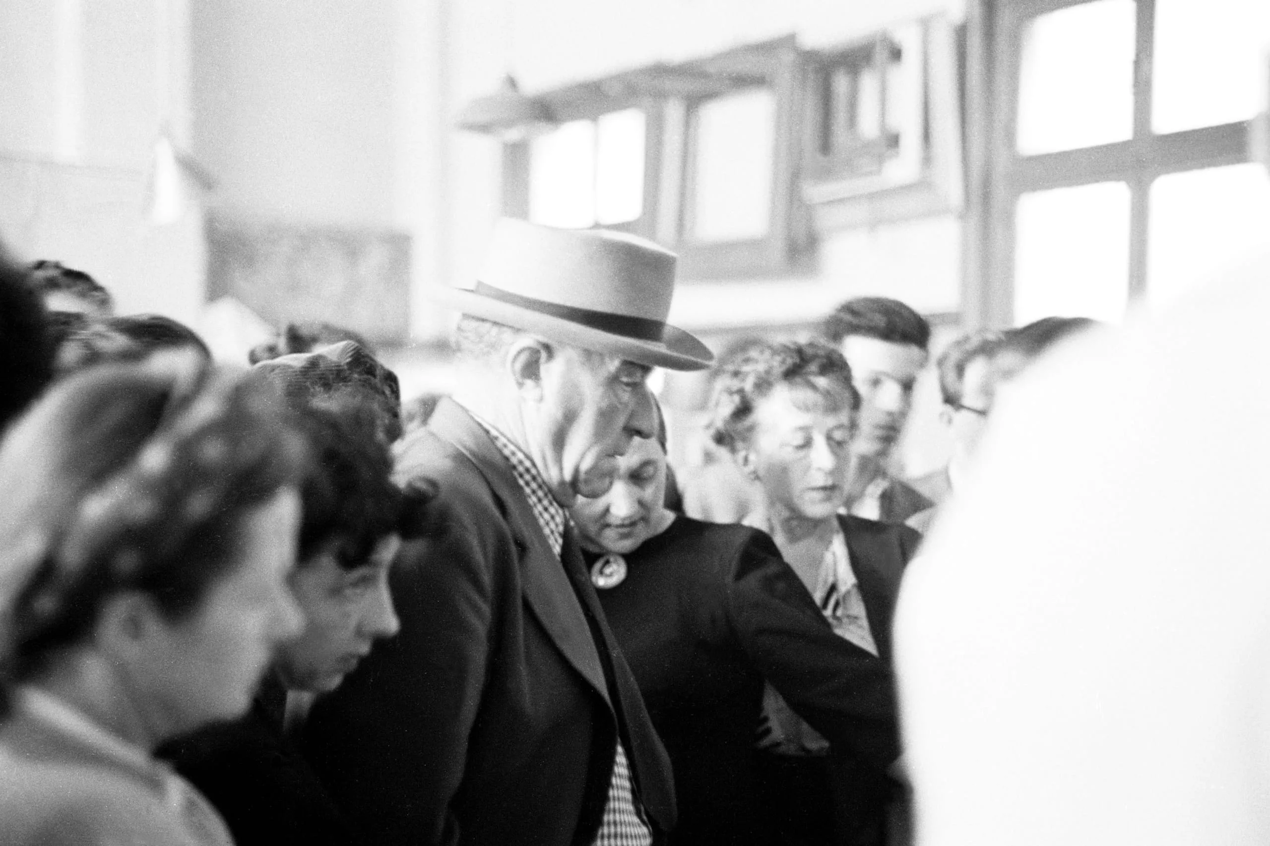 Black and white photograph of a crowd indoors, centered on an older man in a wide-brimmed felt hat looking downward, surrounded by blurred figures