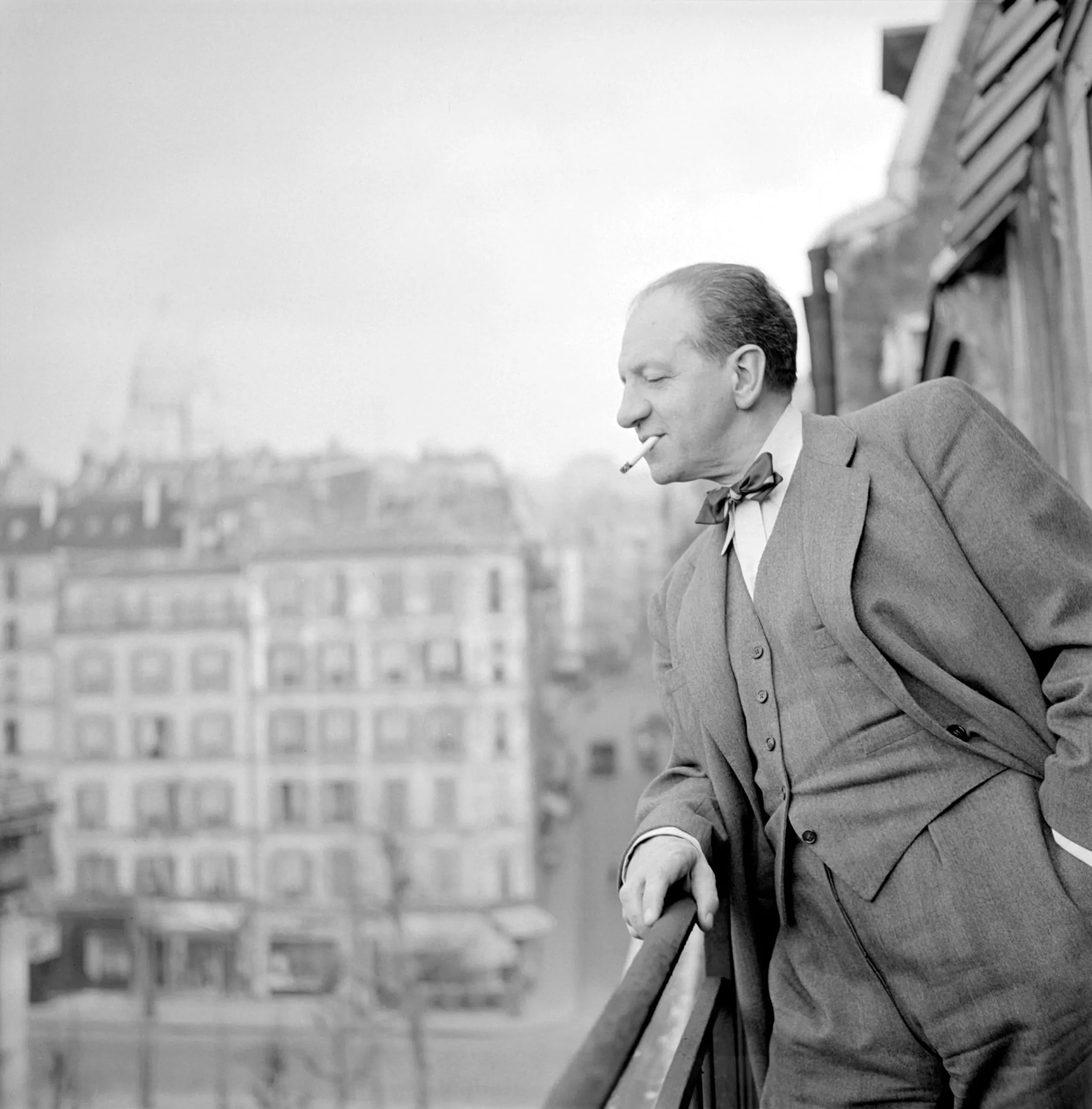 Black and white photograph of a man in a three-piece suit and bow tie leaning on a balcony railing, a cigar in his mouth, with a European cityscape behind him