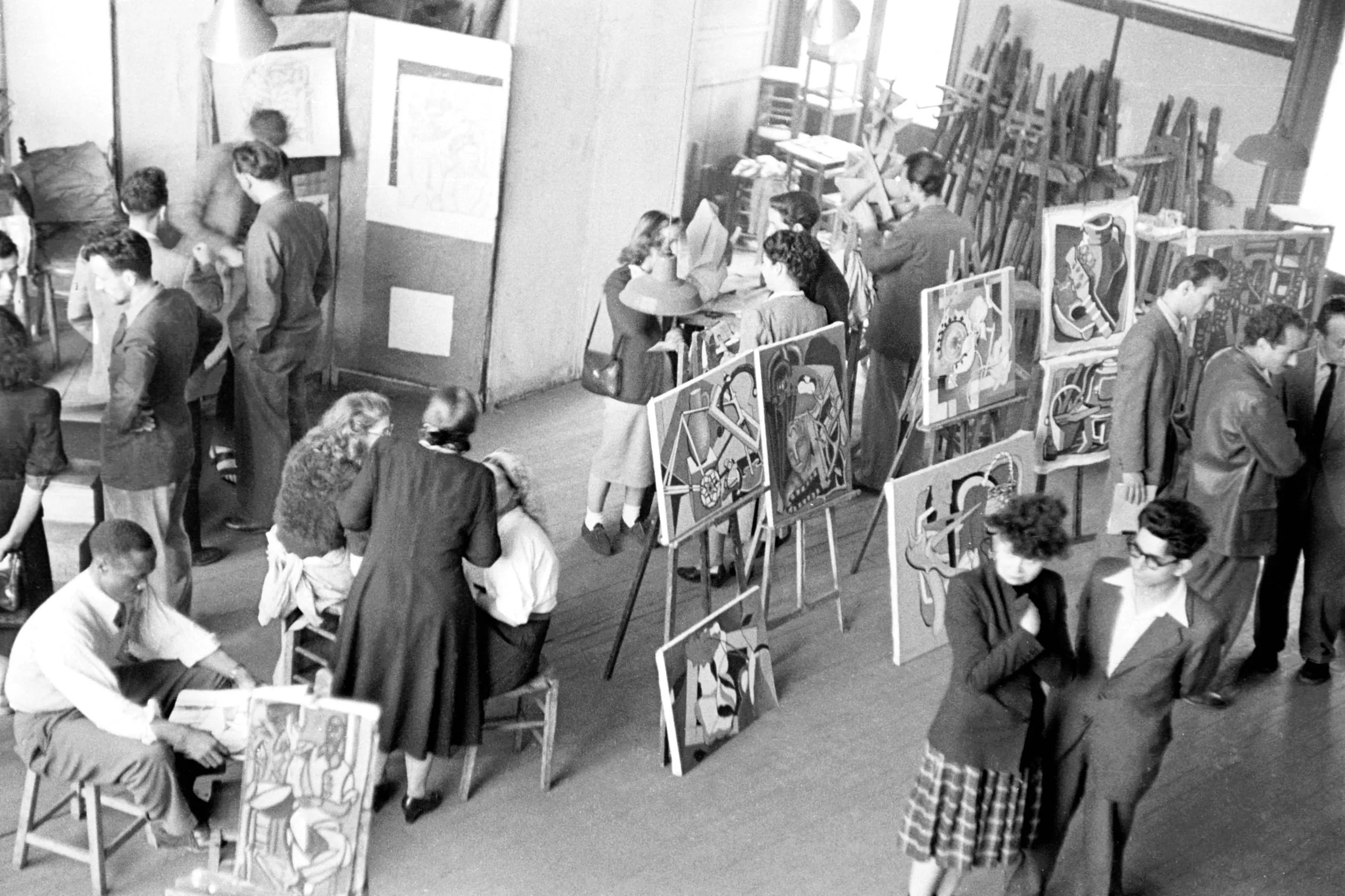 Black and white photograph taken from above, showing a crowded room with people examining paintings on wooden easels and wall panels, mid-twentieth century setting