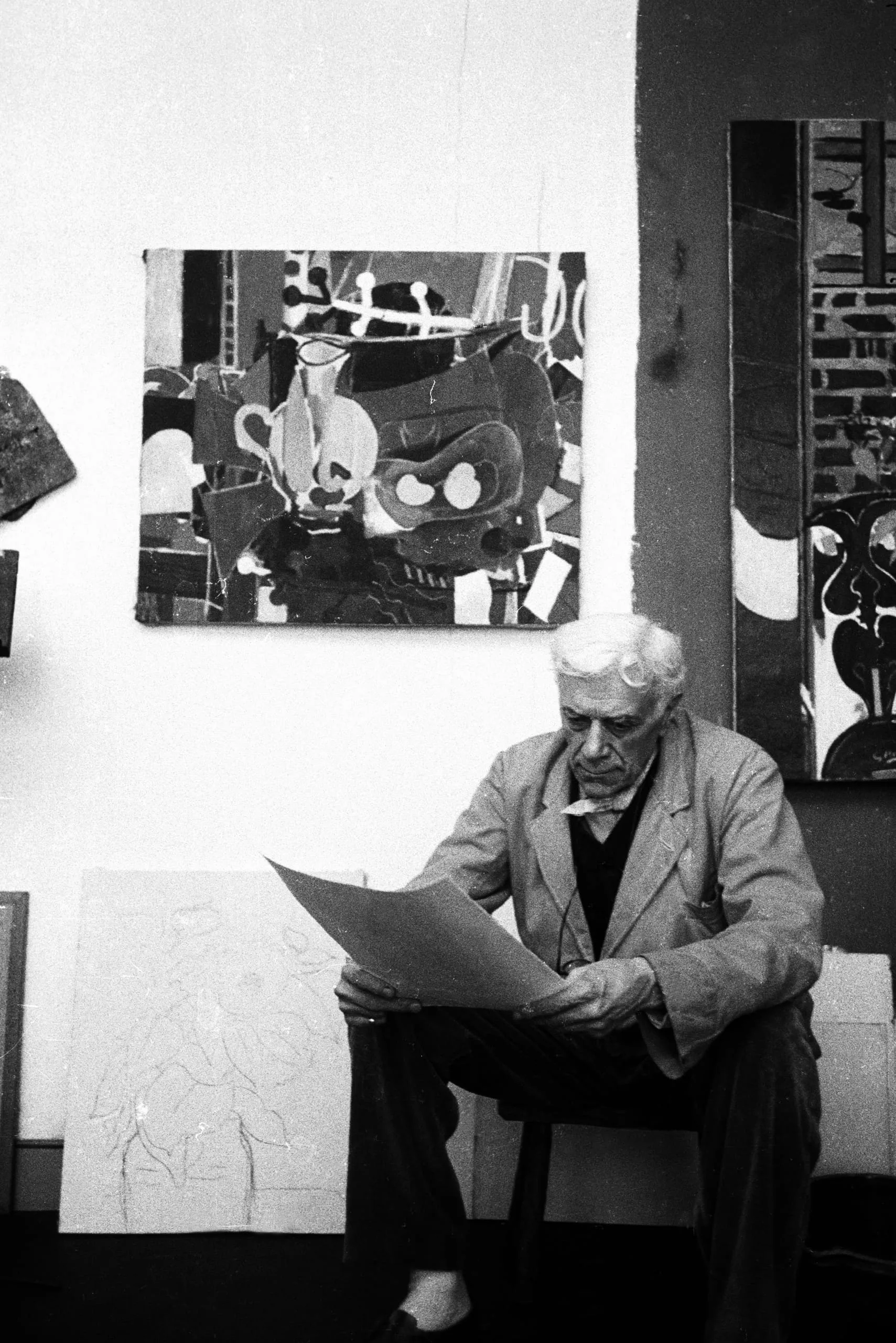 Black and white photograph of an elderly man seated in a studio, bent forward examining a large sheet of paper, with abstract paintings visible on the wall behind him