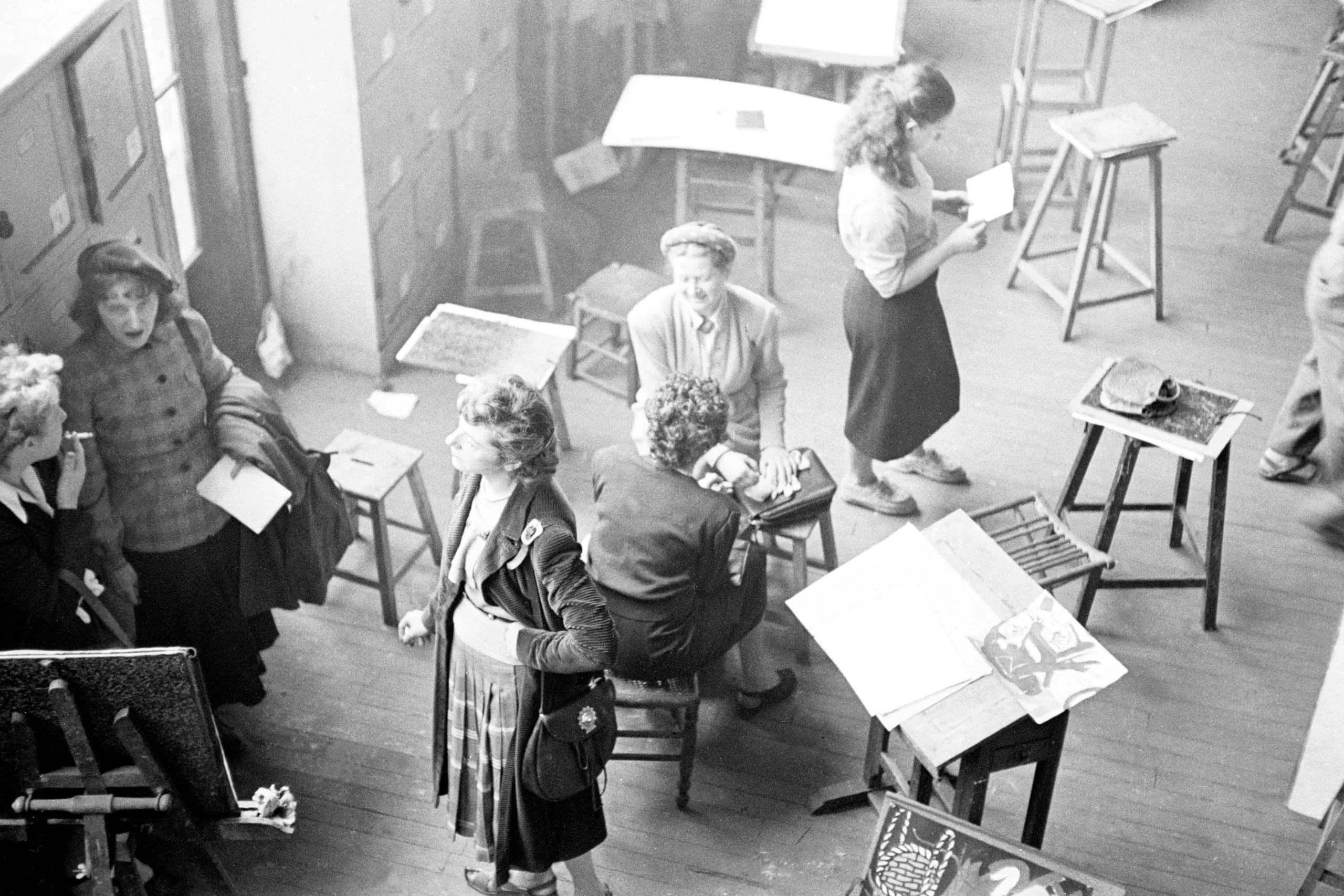 Black and white photograph shot from above, five women in mid-century dress moving through an art studio scattered with wooden stools, easels, and printed artworks