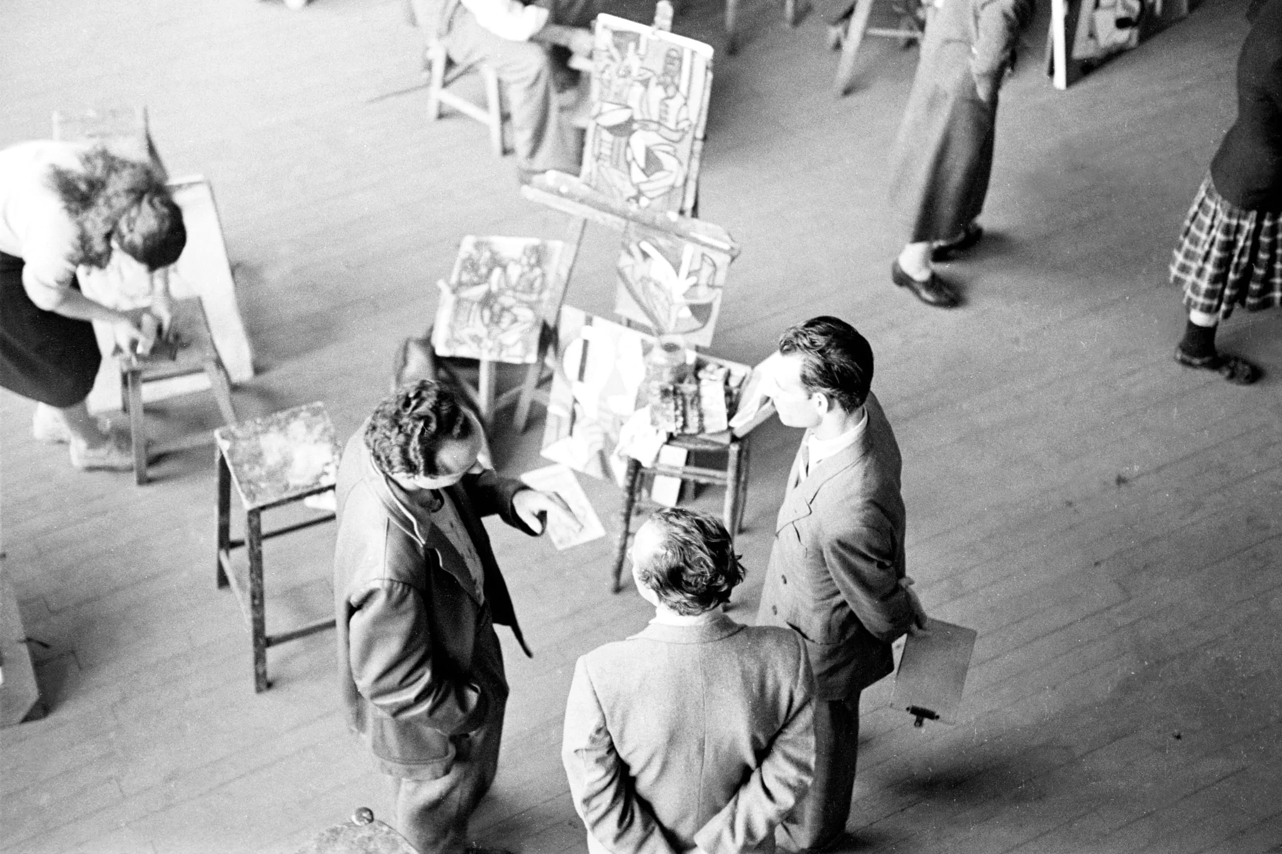 Black and white photograph taken from above, showing three figures in conversation among easels holding paintings on a wooden floor