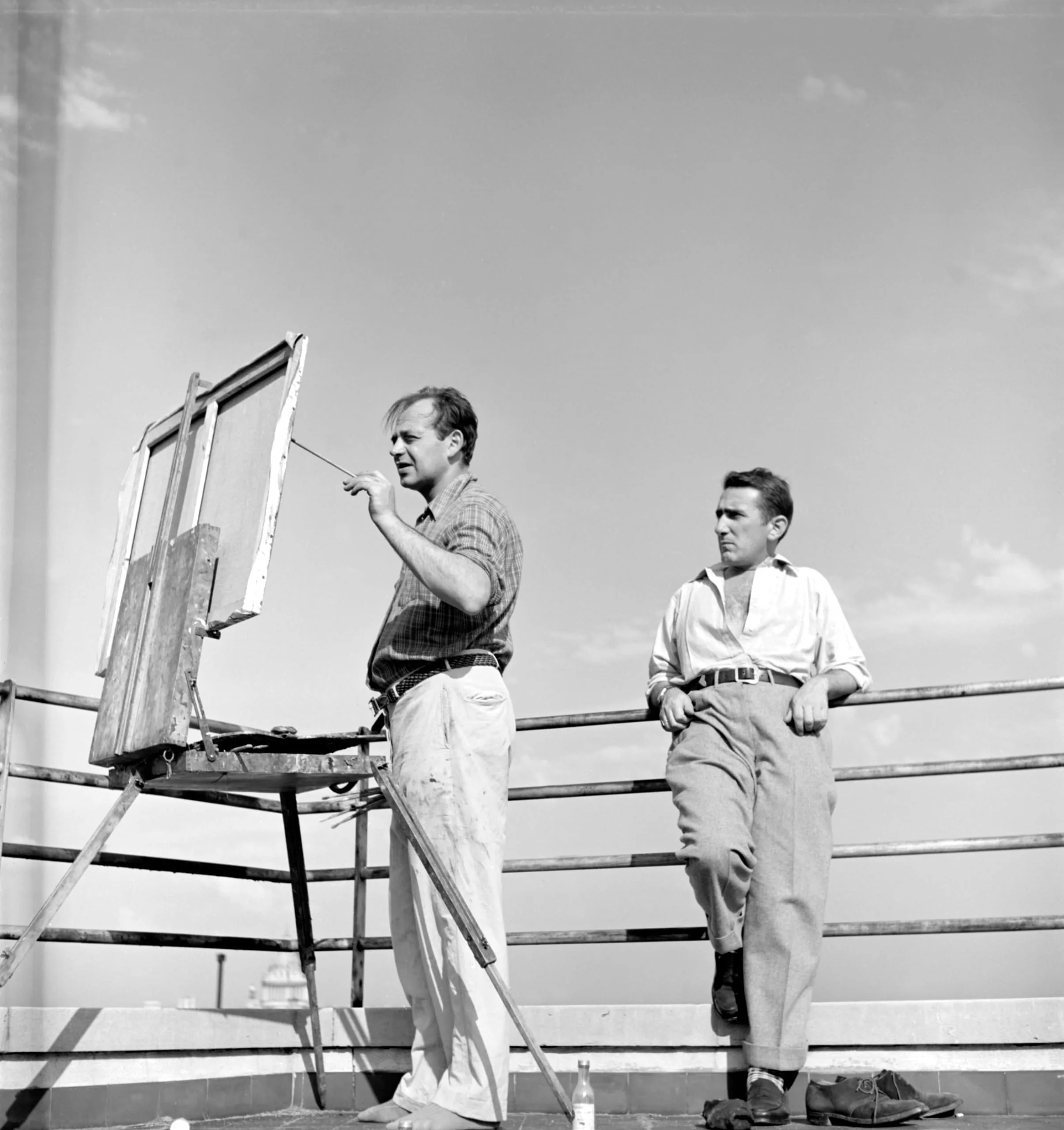 Black and white photograph of two men outdoors, one painting at a wooden easel while the other looks on, leaning against a metal railing