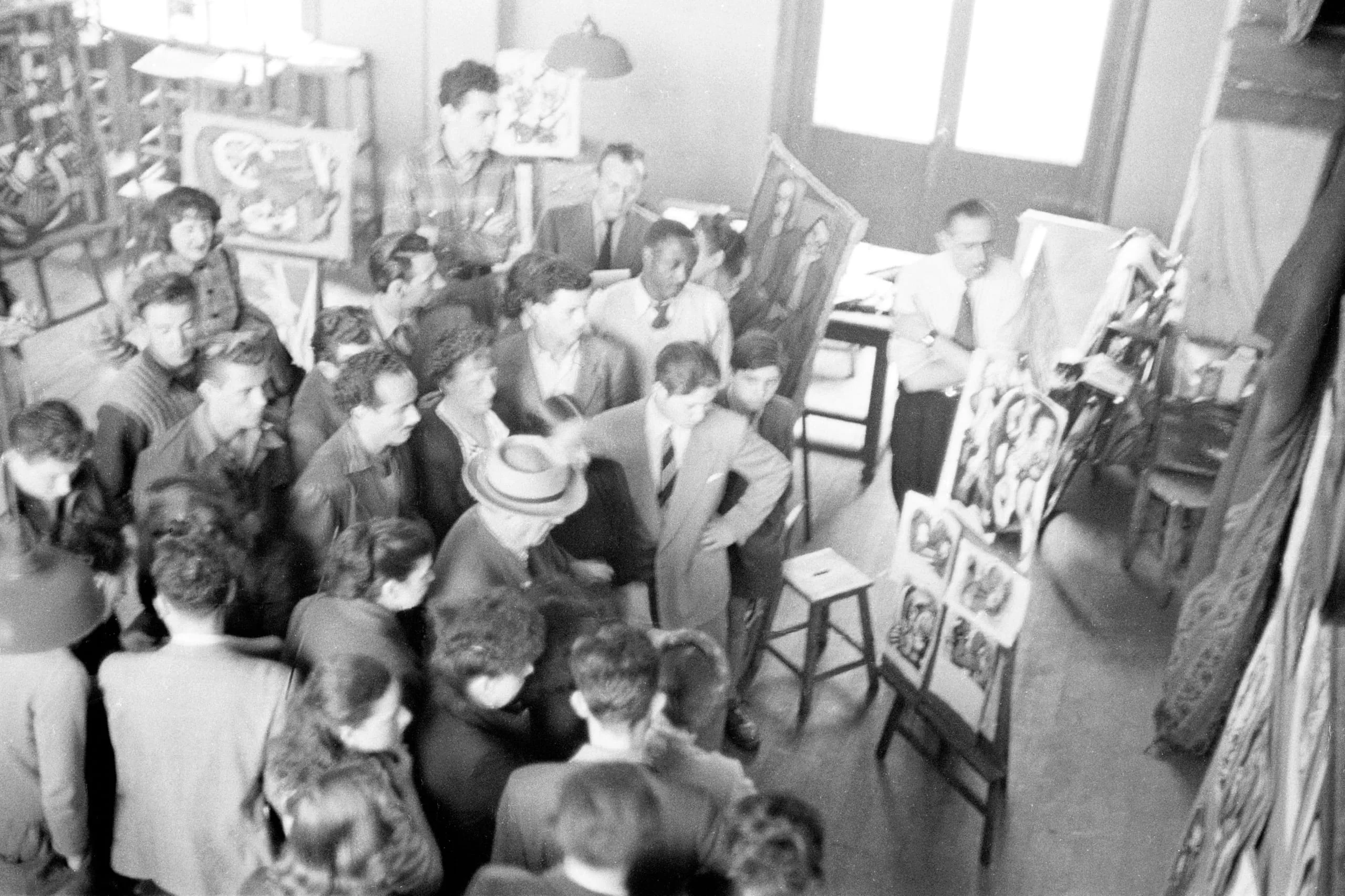 Black and white photograph taken from above, showing a crowded interior studio or gallery with roughly thirty people gathered around paintings on easels