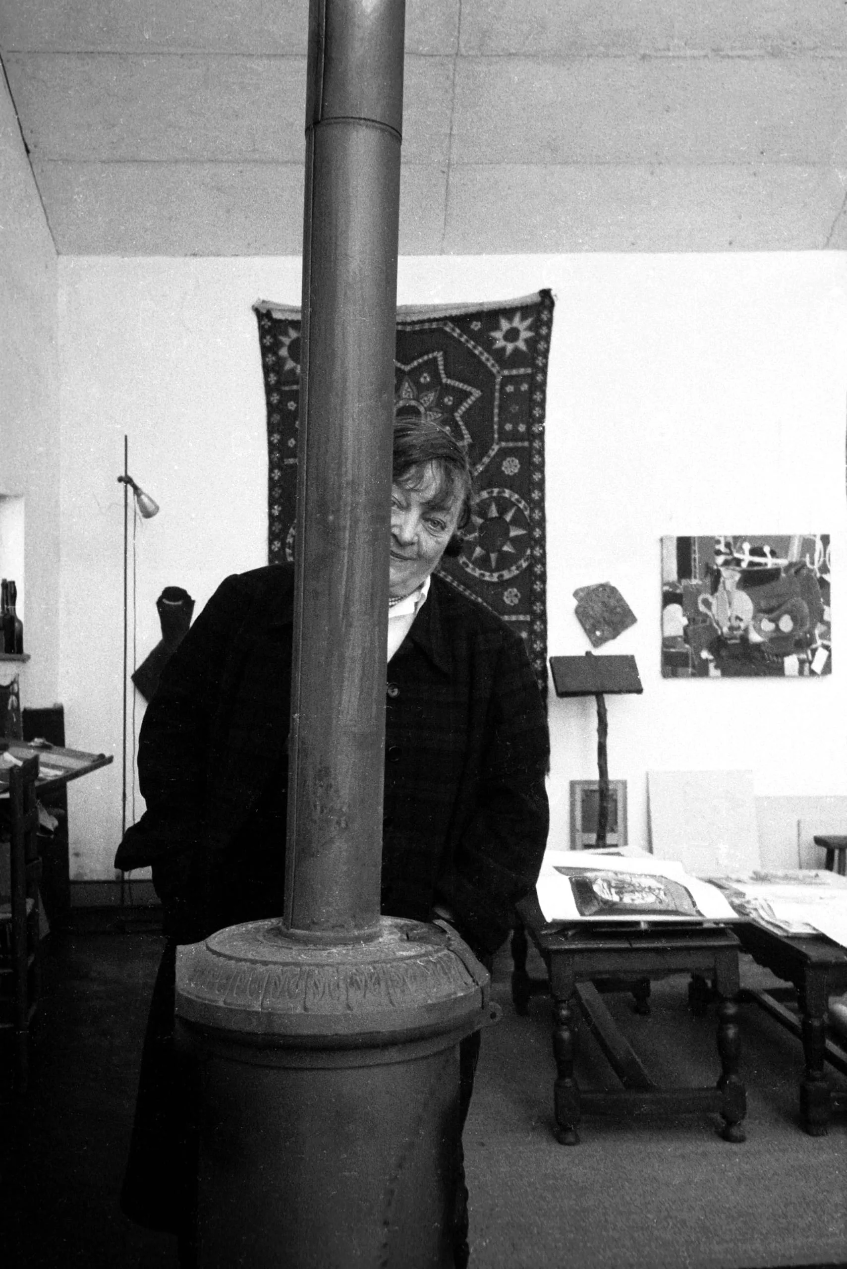 Black and white photograph of a white-haired person peering around a large cylindrical stovepipe in a studio interior, with a patterned textile and pinned photographs on the wall behind