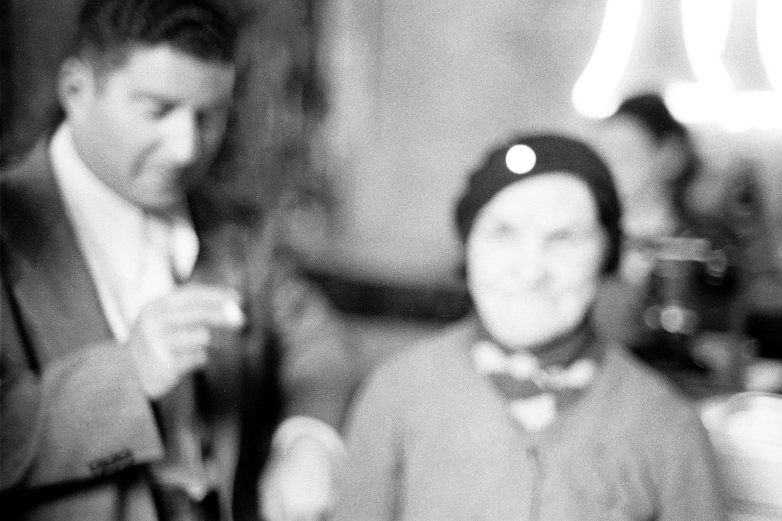 Blurry black and white photograph of a man and woman standing together indoors, both softly out of focus