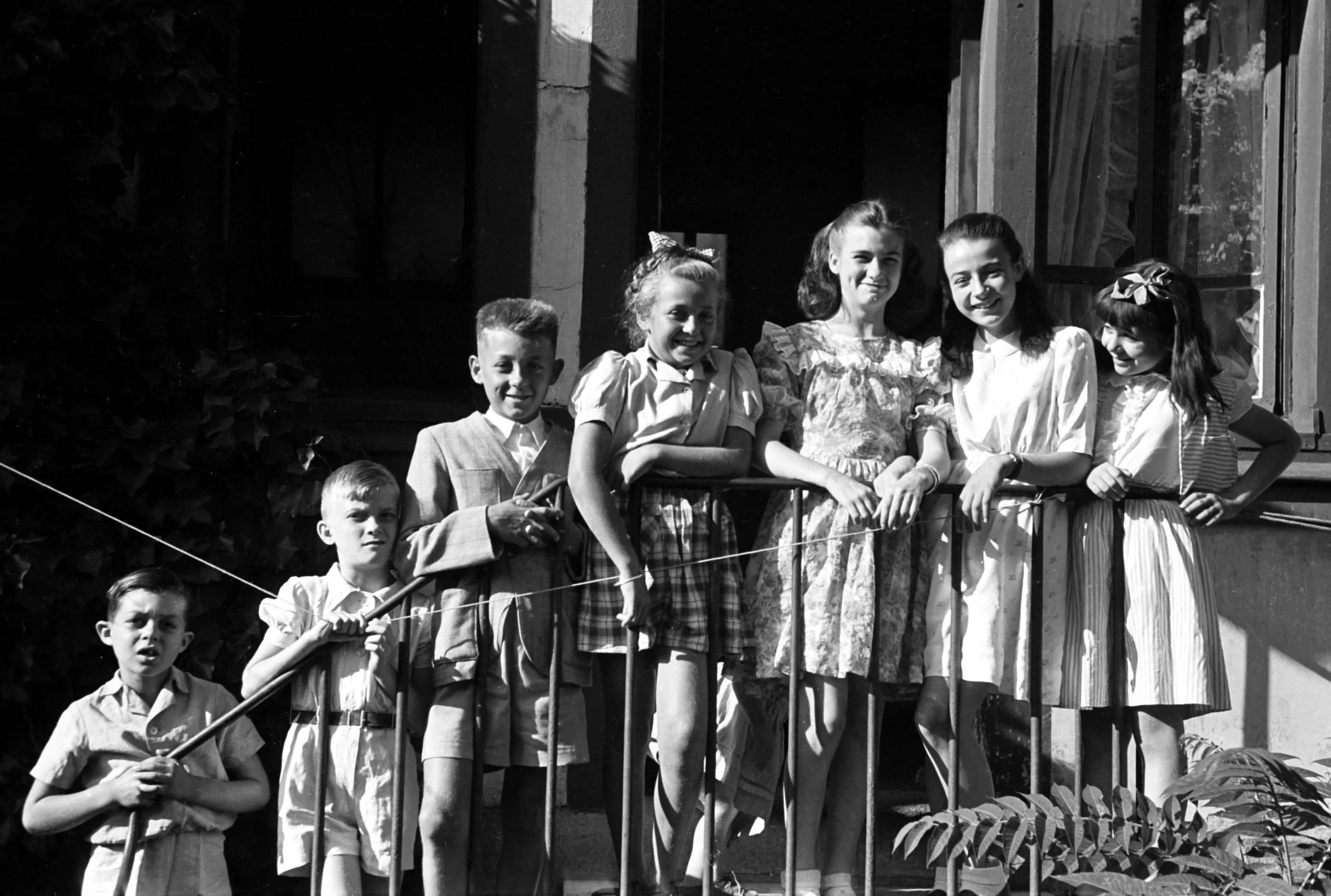 Black and white photograph of seven children on building steps, ranging in age, some holding a stick with string, all facing the camera in bright sunlight