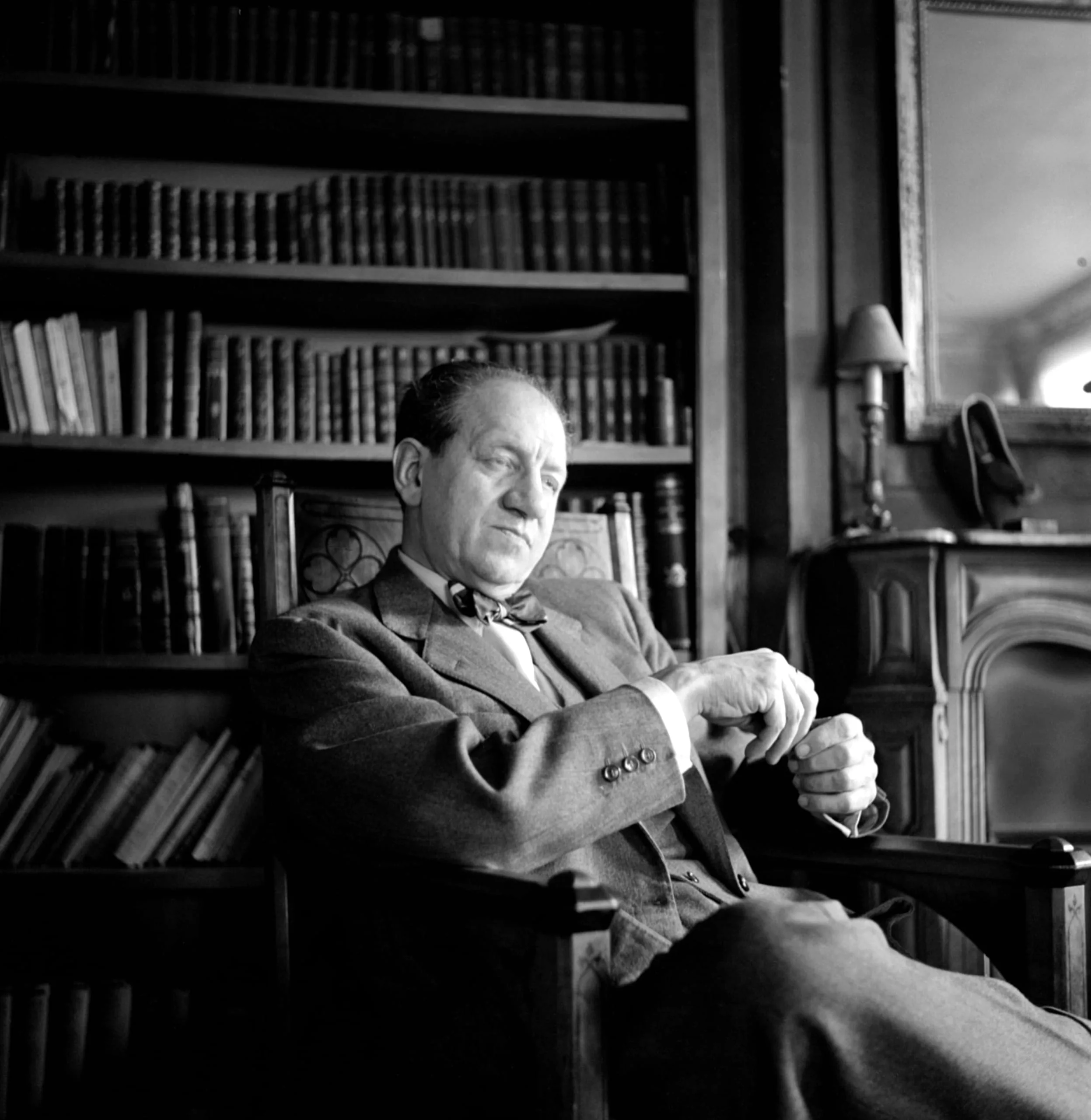 Black and white photograph of a white man in a tweed suit and bow tie seated in a wooden chair, his eyes downcast, bookshelves visible behind him