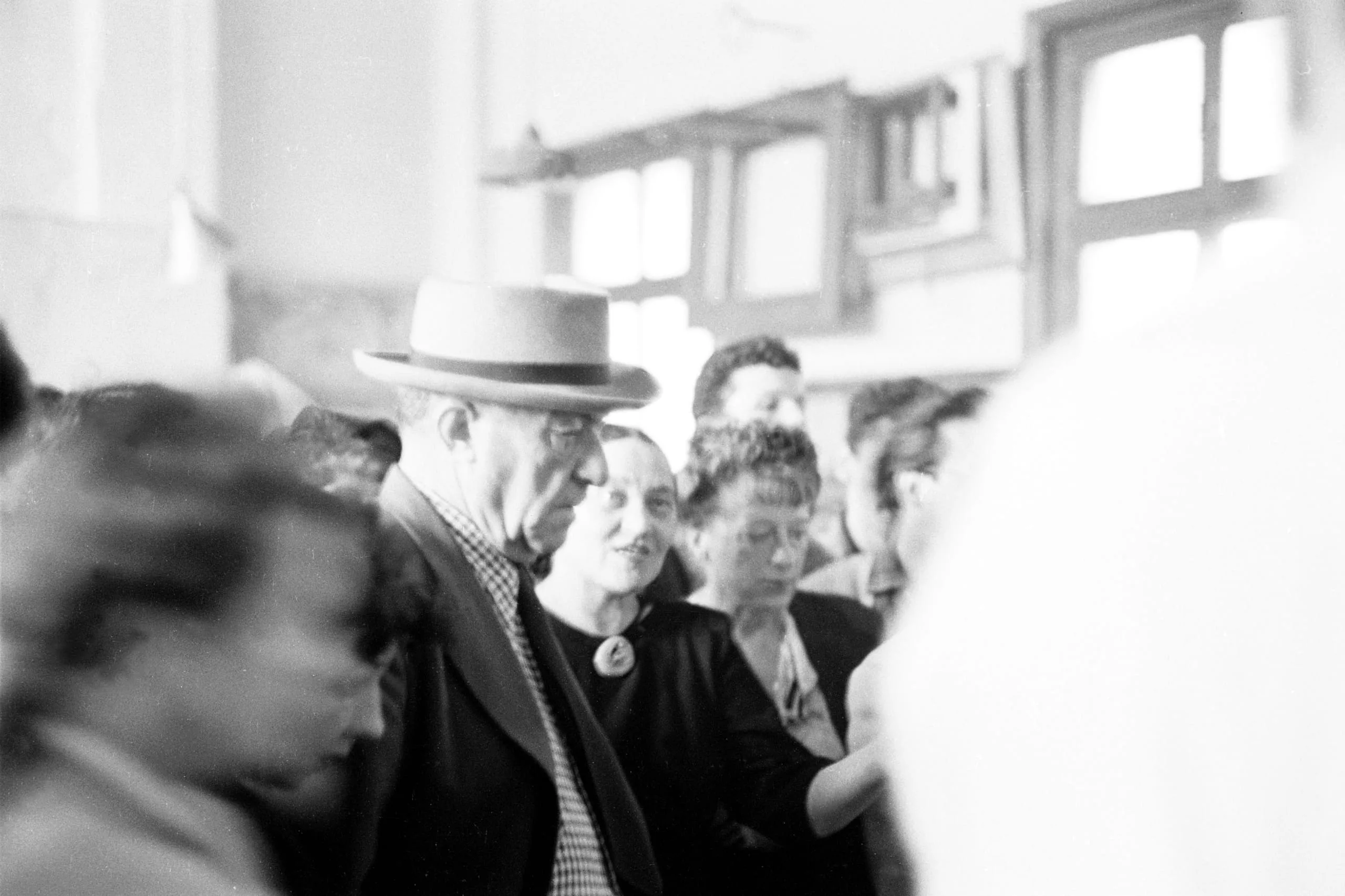 Black and white photograph of a crowd in an indoor space, centered on an older man in a wide-brimmed hat and dark coat, surrounded by other figures