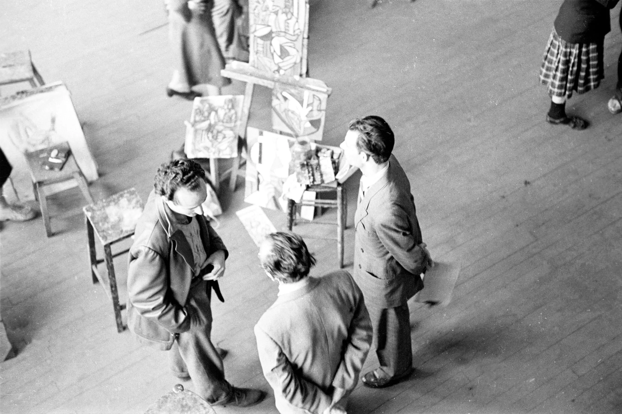 Black and white photograph shot from above, three people conversing near paintings propped on chairs in a large room with wooden plank floors