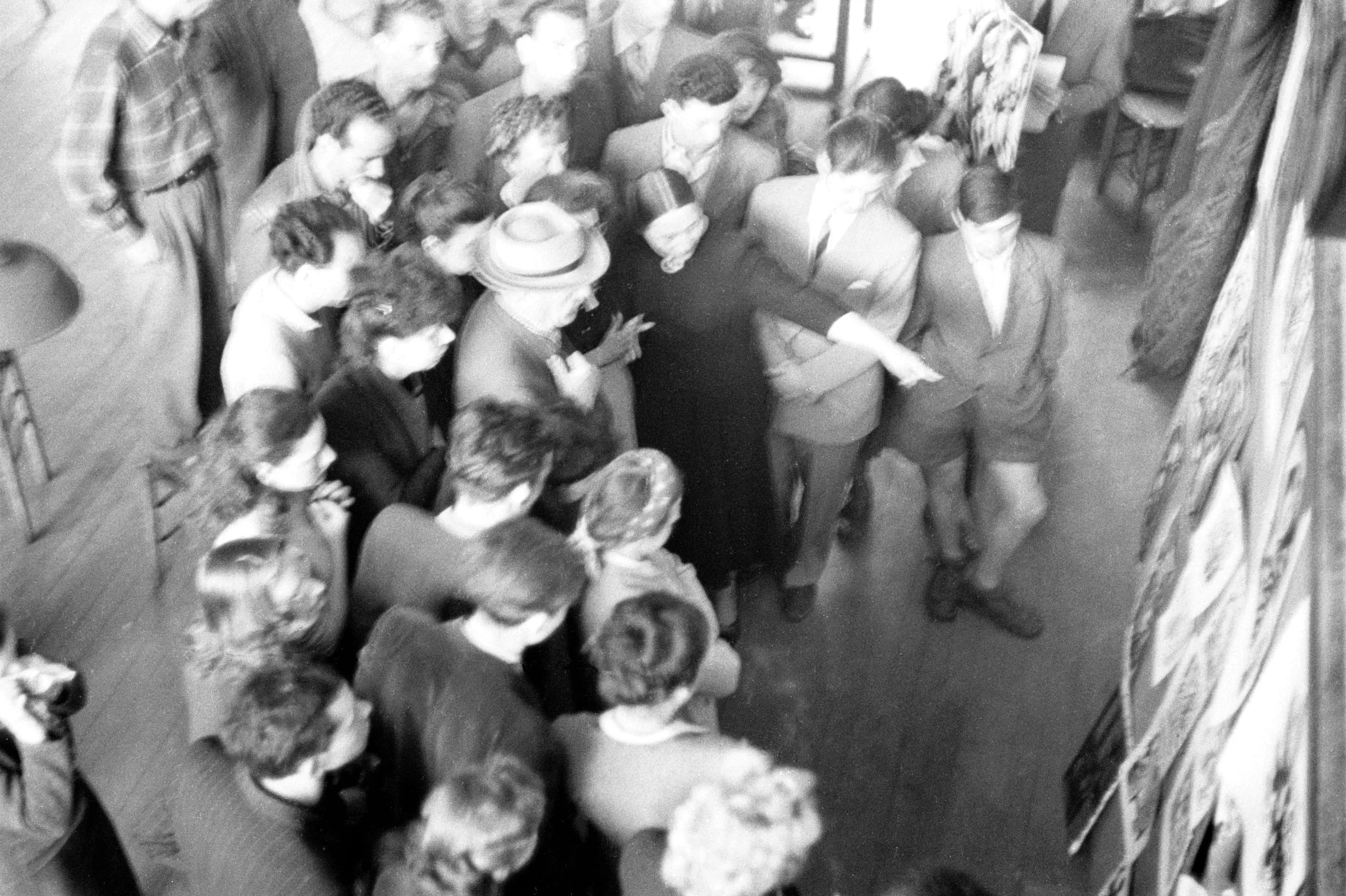 Black and white photograph shot from above, looking down onto a crowd of people in an interior space, with a patterned textile visible along the right edge