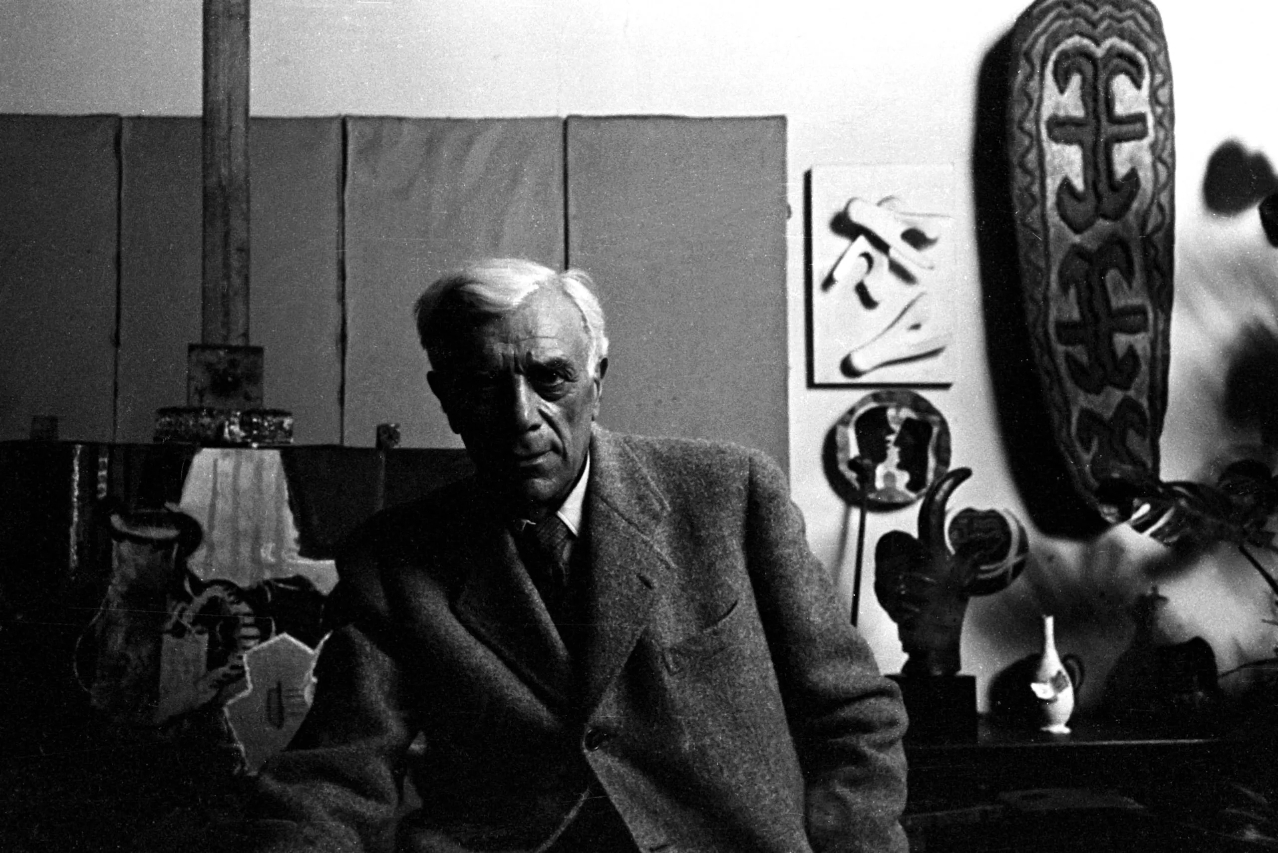 Black and white photograph of an older white-haired man in a tweed jacket, seated in a studio surrounded by artworks and small sculptures, lit from the right with deep shadows