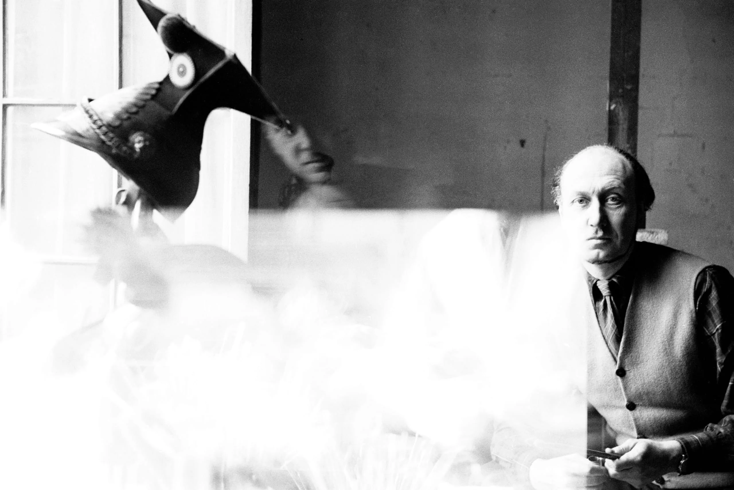Black and white photograph of a man in a vest and tie seated at a table, with a sculptural dark bird figure and a partially visible woman near a window to the left, lower half overexposed
