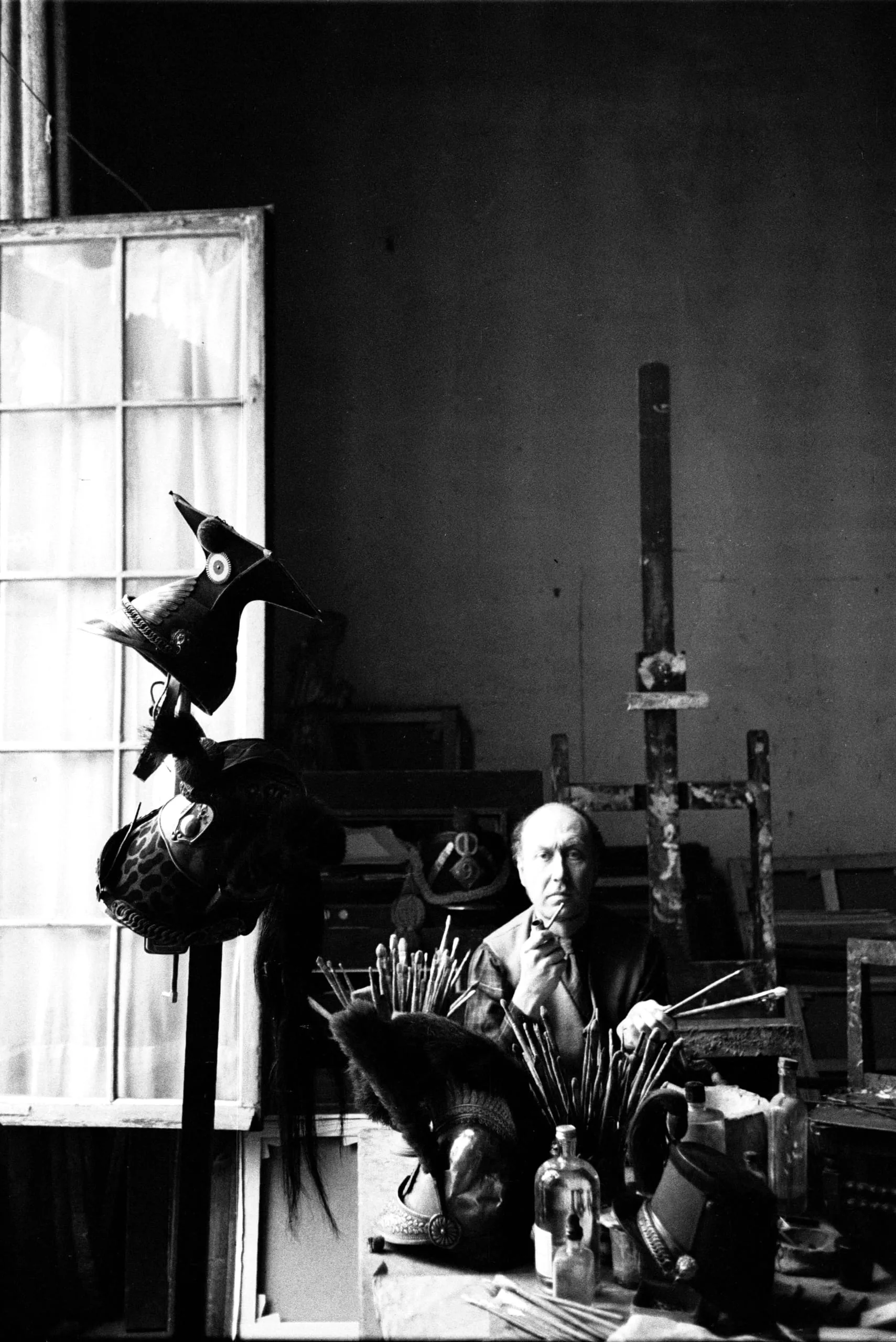 Black and white photograph of a bald man seated in a cluttered artist's studio, framed by dark sculptural objects in the foreground and paintbrushes on a worktable