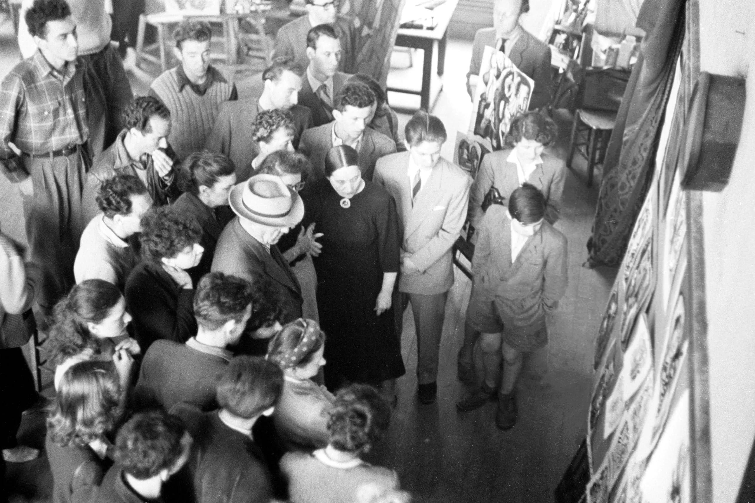 Black and white photograph taken from above, showing a crowd of roughly twenty people gathered in a studio or gallery, looking toward artworks hung on the right wall