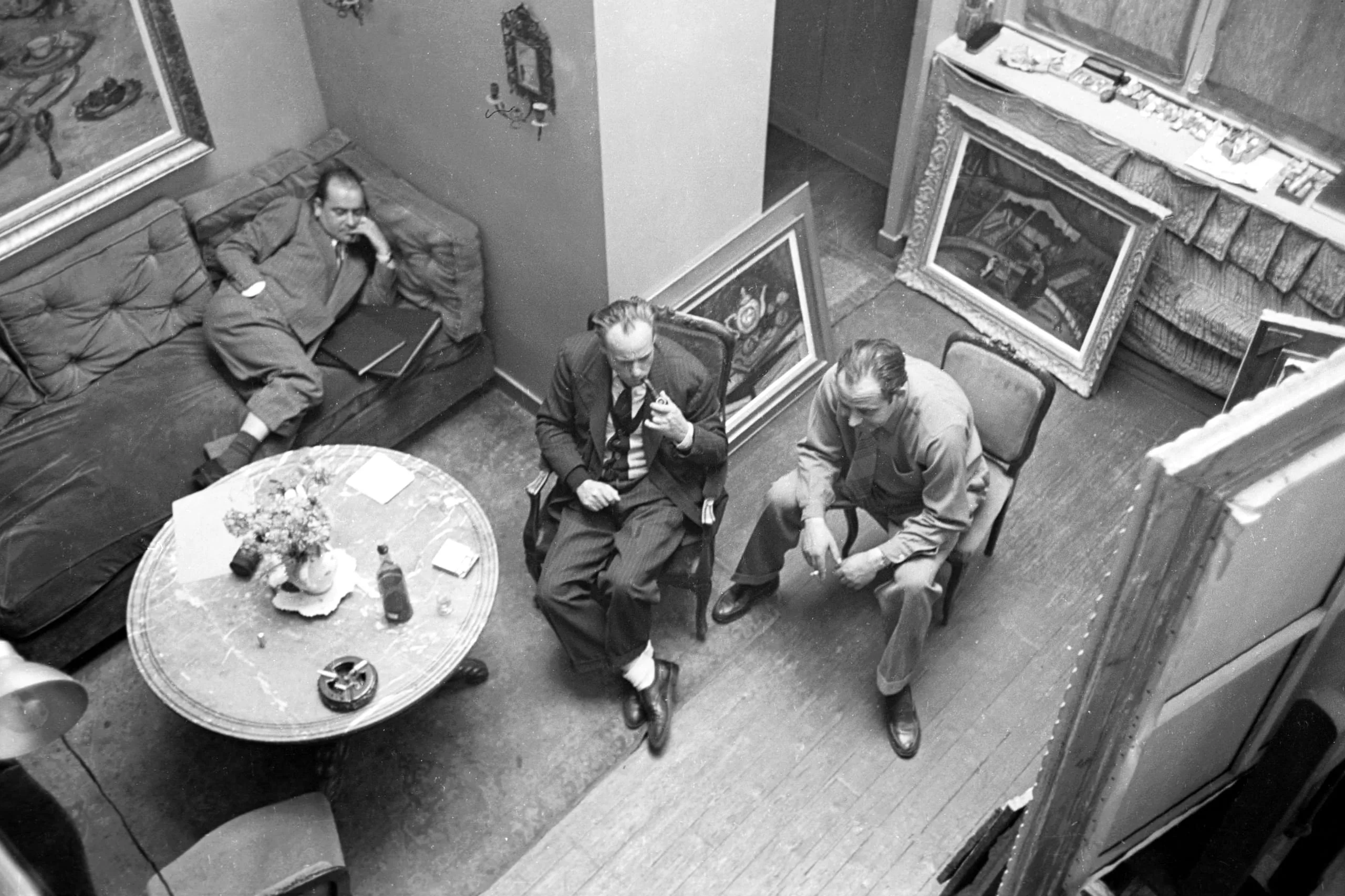 Black and white photograph shot from above, three men in suits sitting and reclining in a paint-spattered studio surrounded by framed paintings