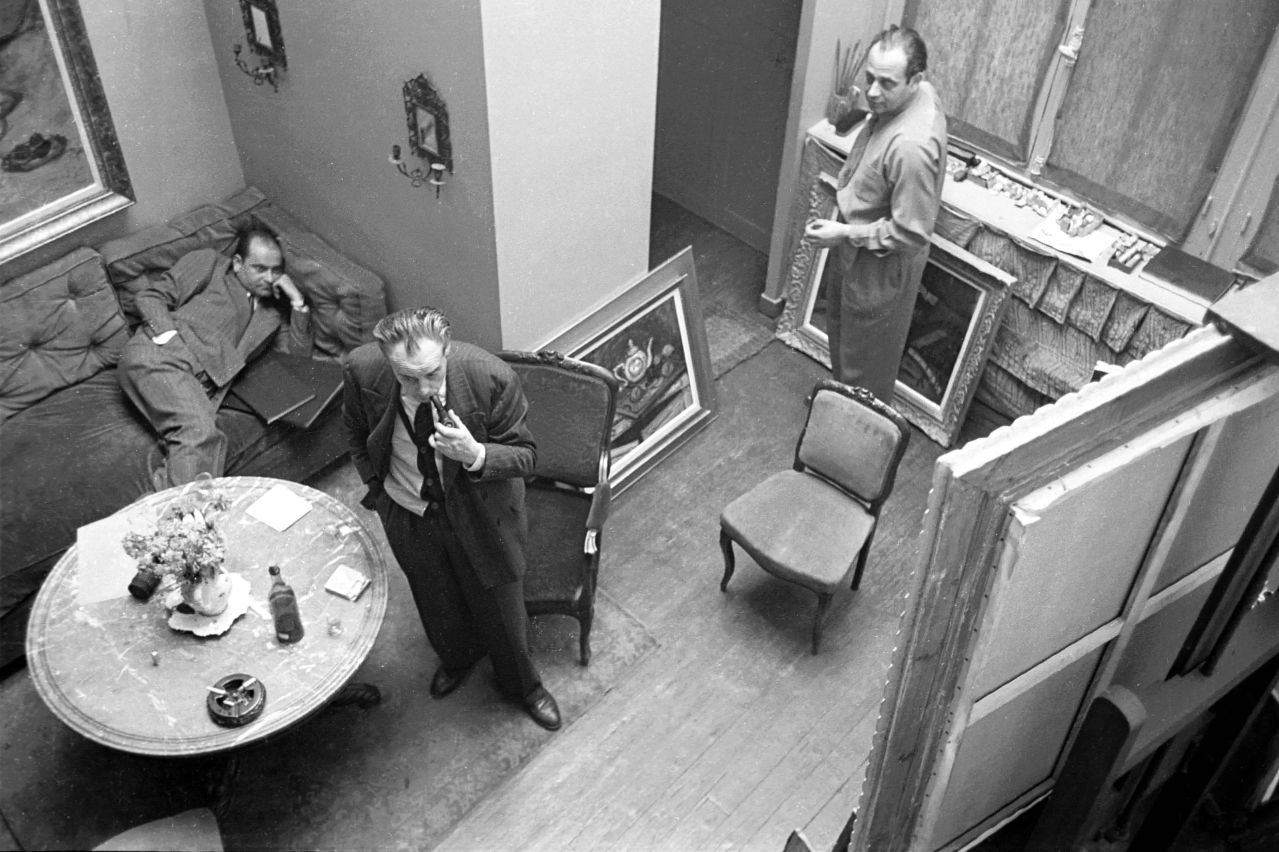 Black and white photograph shot from above, three men in a room crowded with framed and unframed canvases, a worn round table, and mismatched chairs