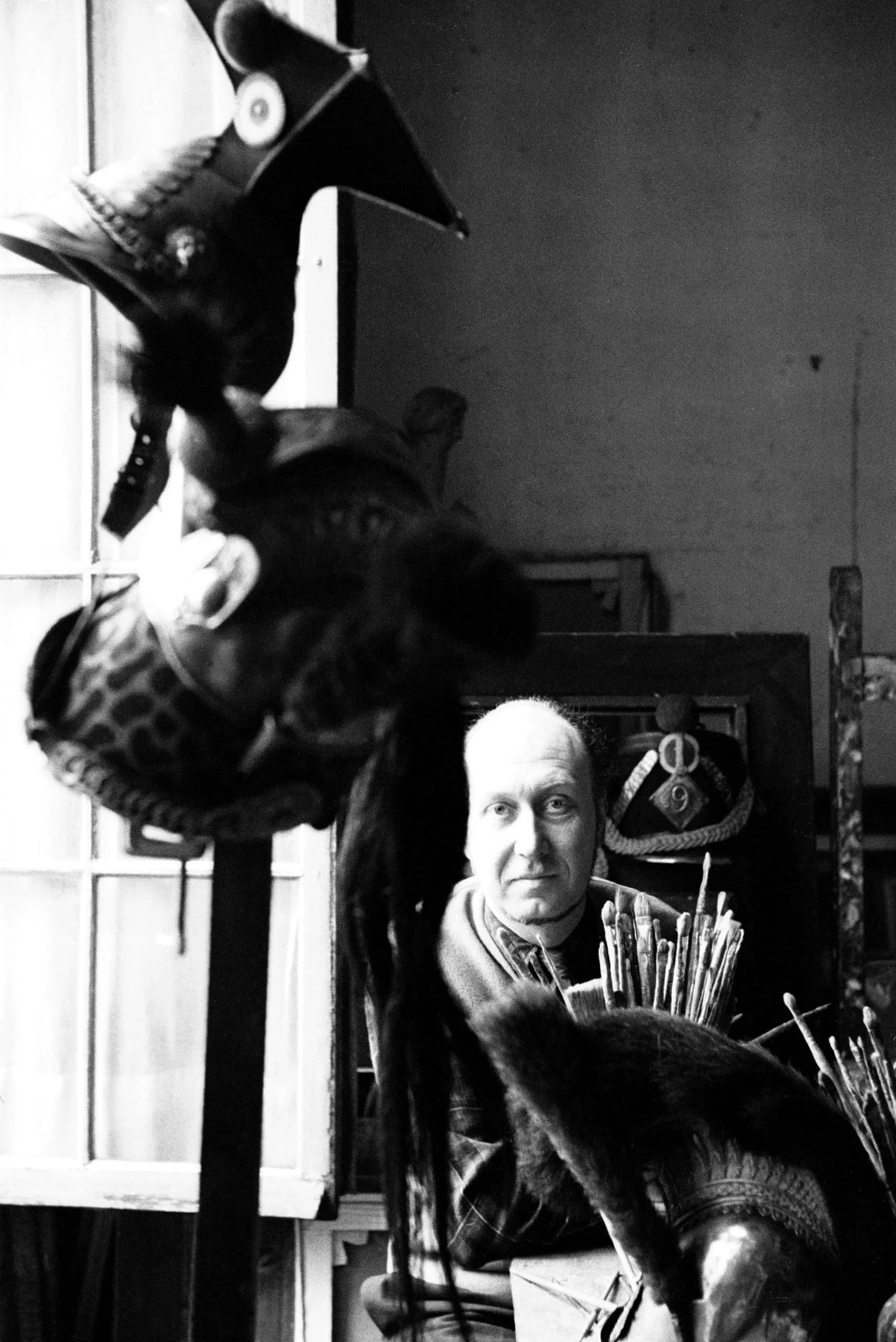 Black and white photograph of a bald man holding a fan of paintbrushes, seated in a cluttered artist's studio, with a large out-of-focus sculptural bird form in the foreground