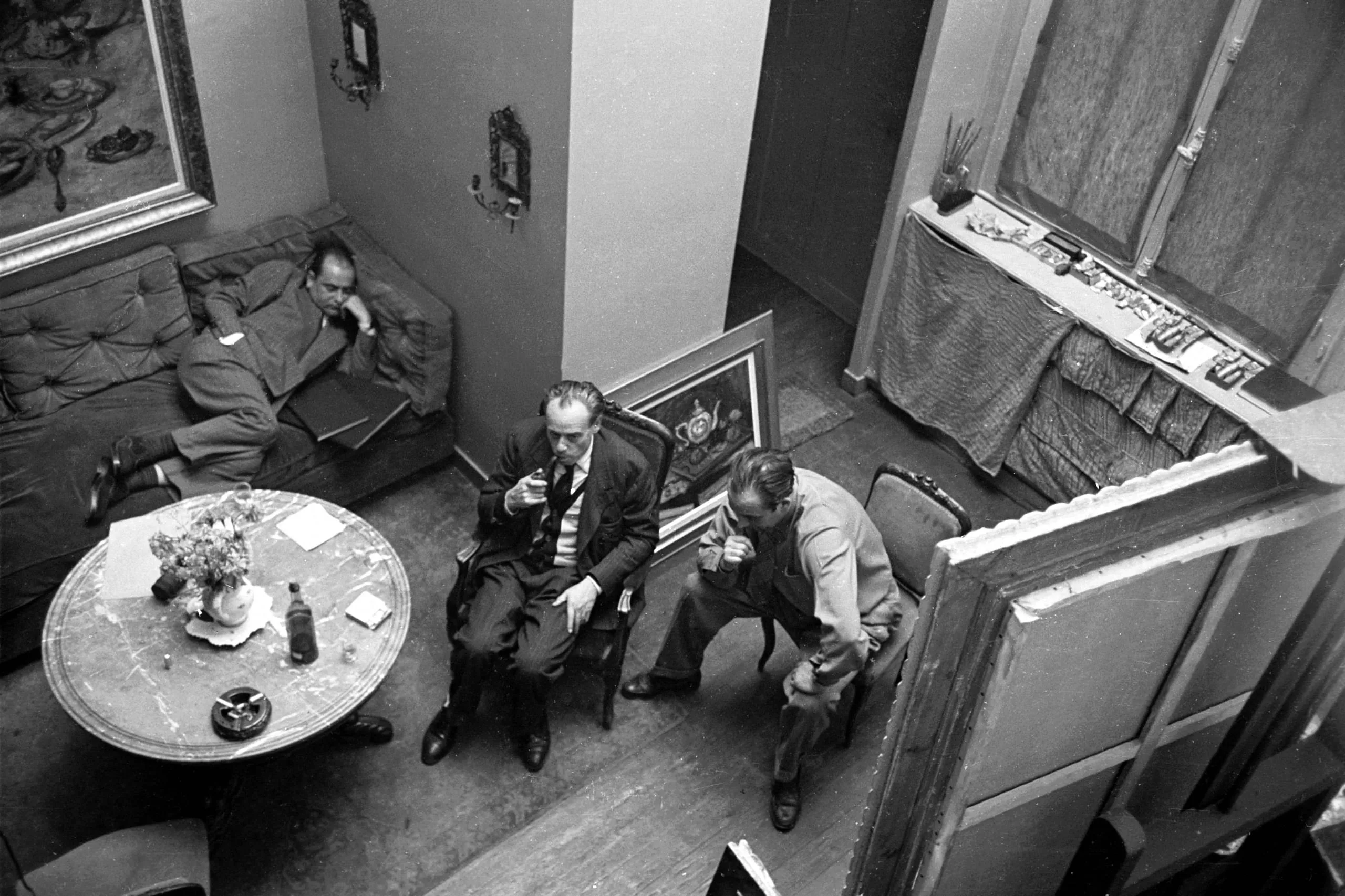 Black and white photograph shot from directly above, showing three men in a cluttered interior room with paintings, a round table, and bare floorboards