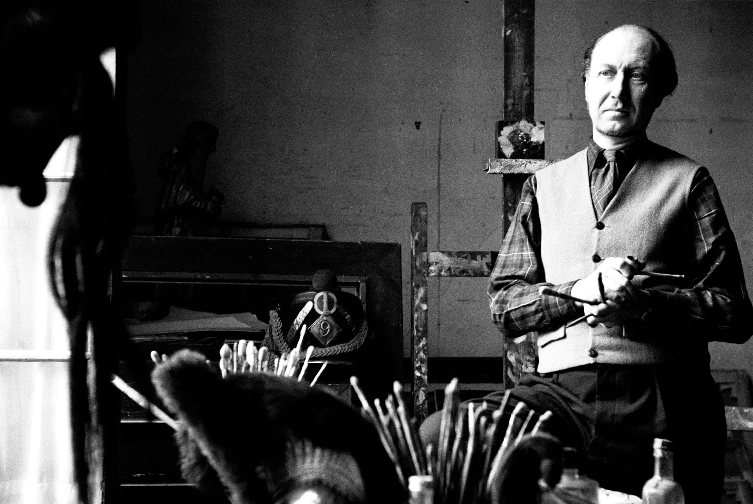 Black and white photograph of a man in a waistcoat and plaid shirt standing in an artist's studio, holding a paintbrush, surrounded by art supplies