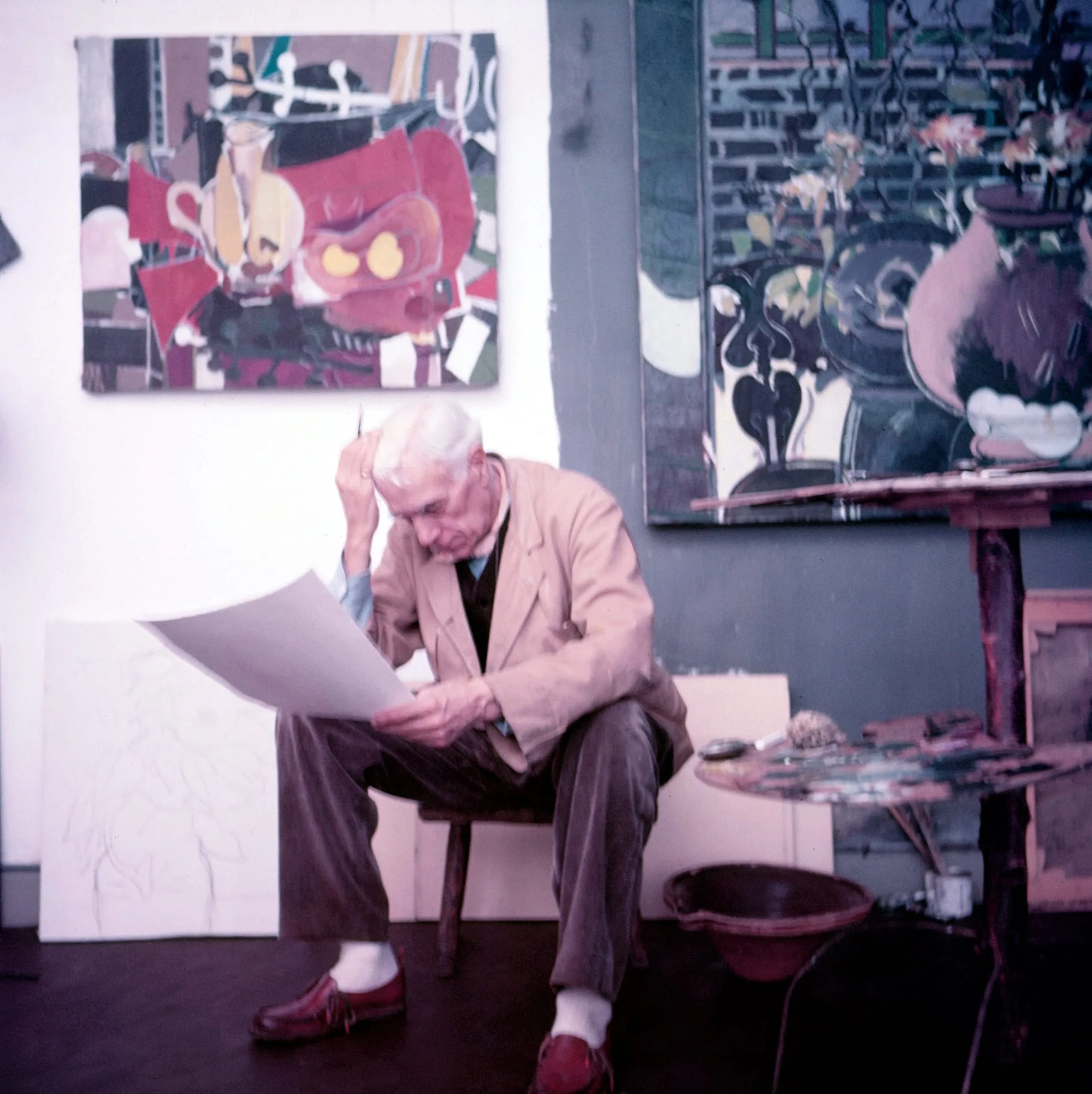 Color photograph of an elderly white-haired man in a cream blazer seated on a stool in an art studio, examining a large sheet of paper, with abstract paintings visible on the wall behind him
