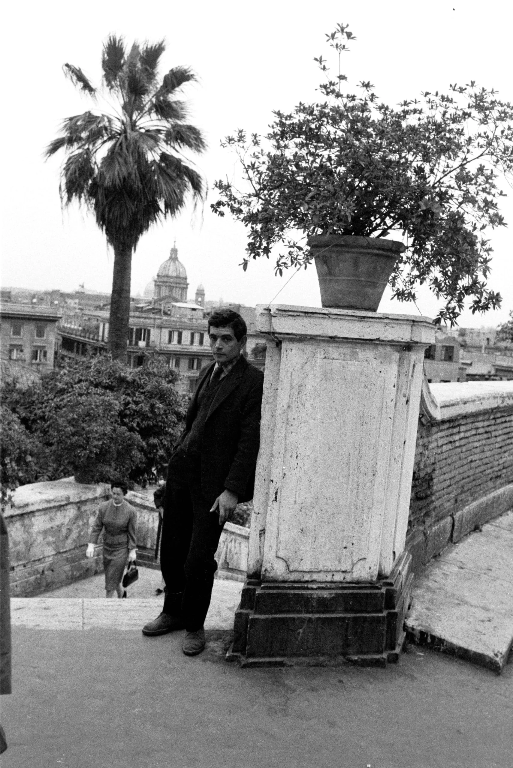 Black and white photograph of a young man leaning against a stone pedestal with a potted shrub, on an elevated terrace overlooking a city skyline with a palm tree and dome visible in the distance