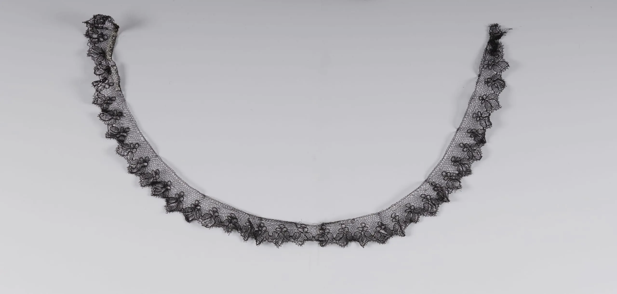 Narrow strip of black lace arranged in a U-shaped curve, with a fine net ground and a scalloped outer edge of repeating leaf or floral motifs