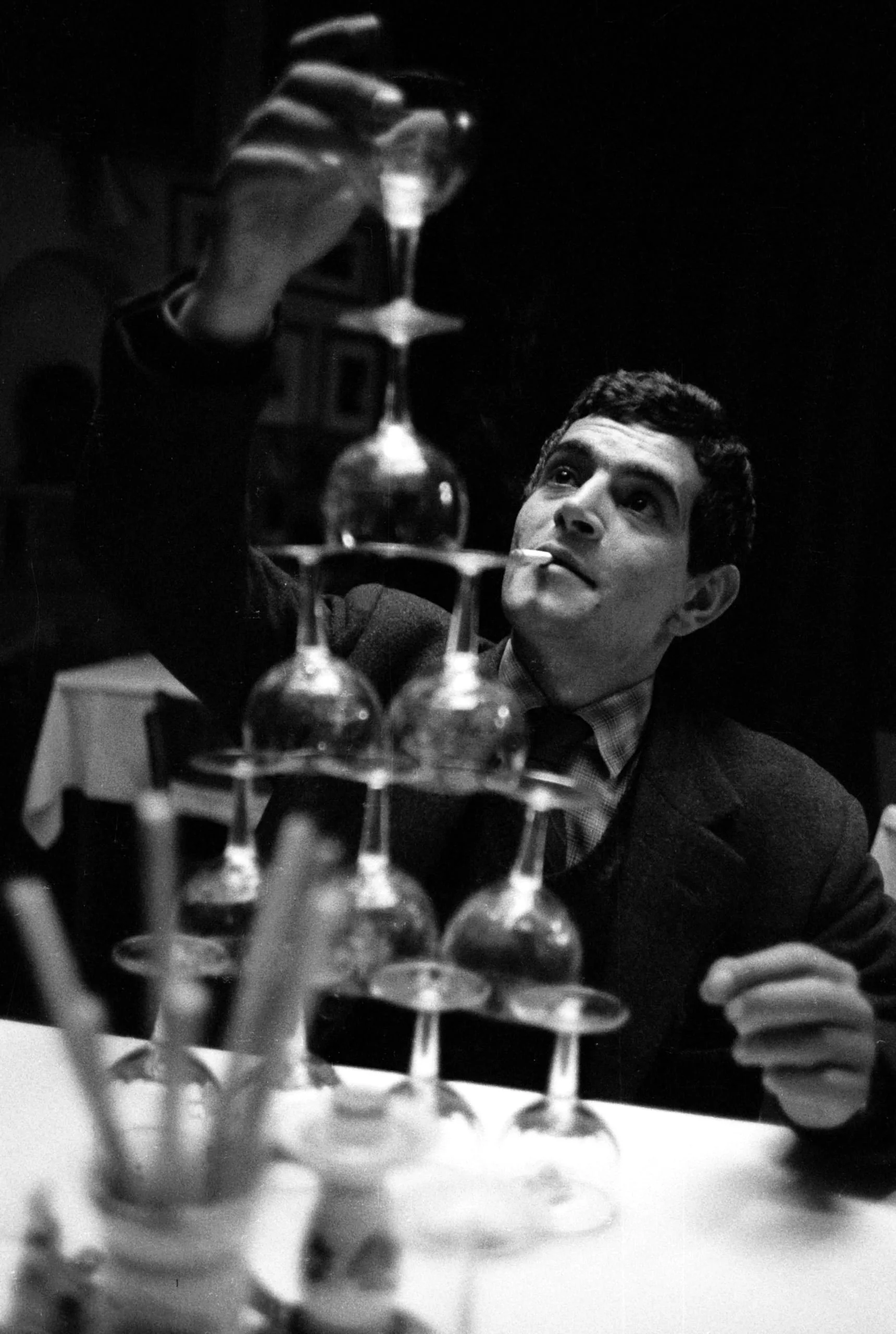Black and white photograph of a man with a cigarette in his lips carefully stacking wine glasses into a pyramid on a white table