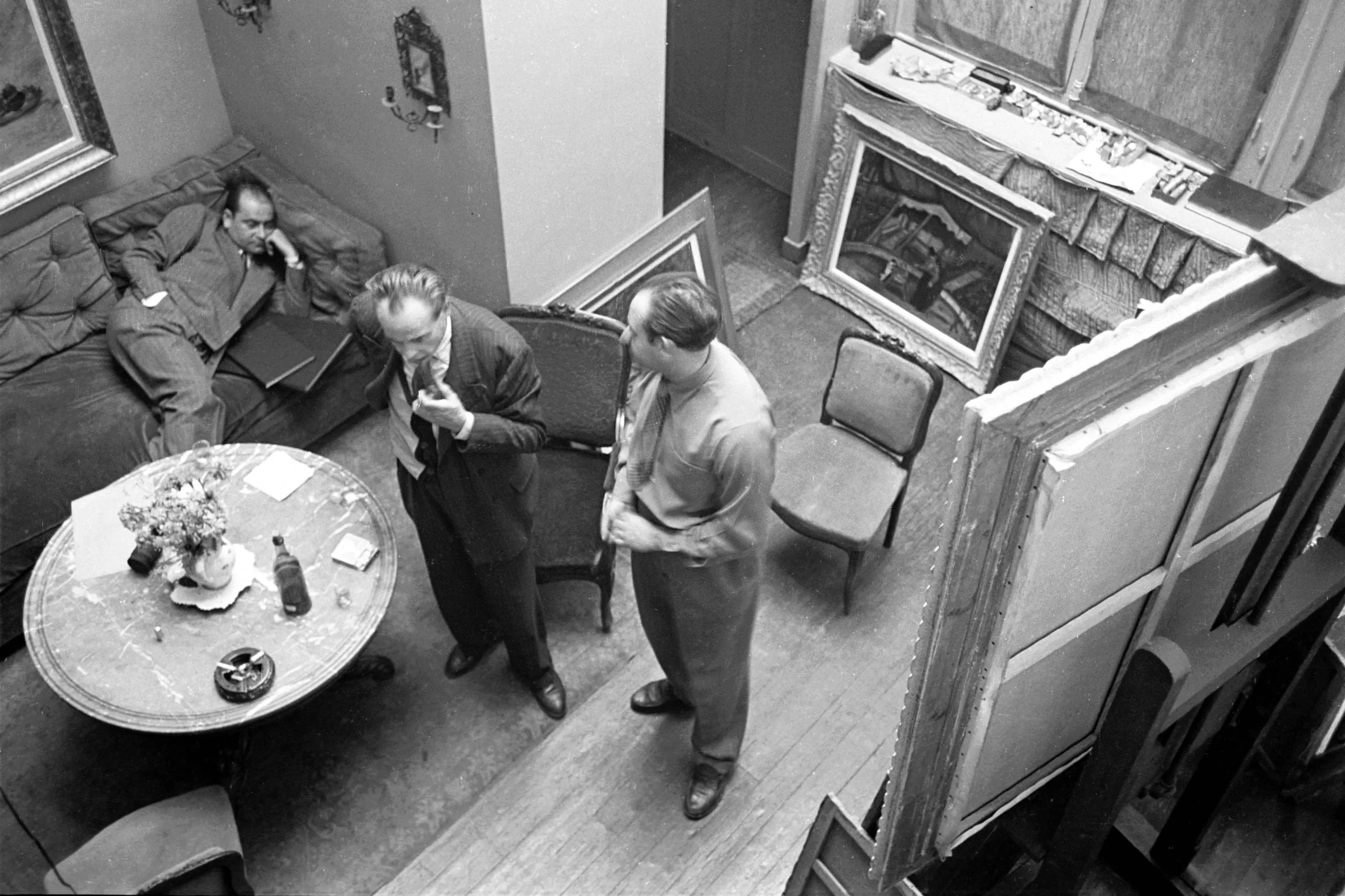 Black and white photograph shot from above, three white men in a room containing leaning canvases, a round table, and scattered chairs