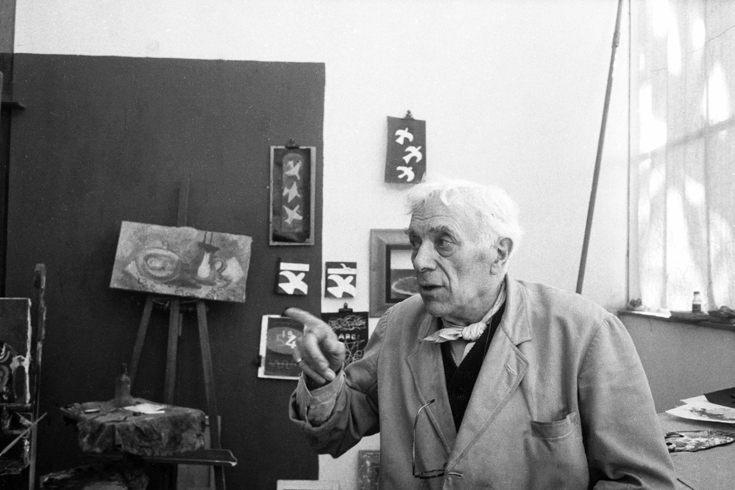 Black and white photograph of an elderly white man in a studio smock, seated in an artist's studio, gesturing with one finger, artworks and an easel visible behind him