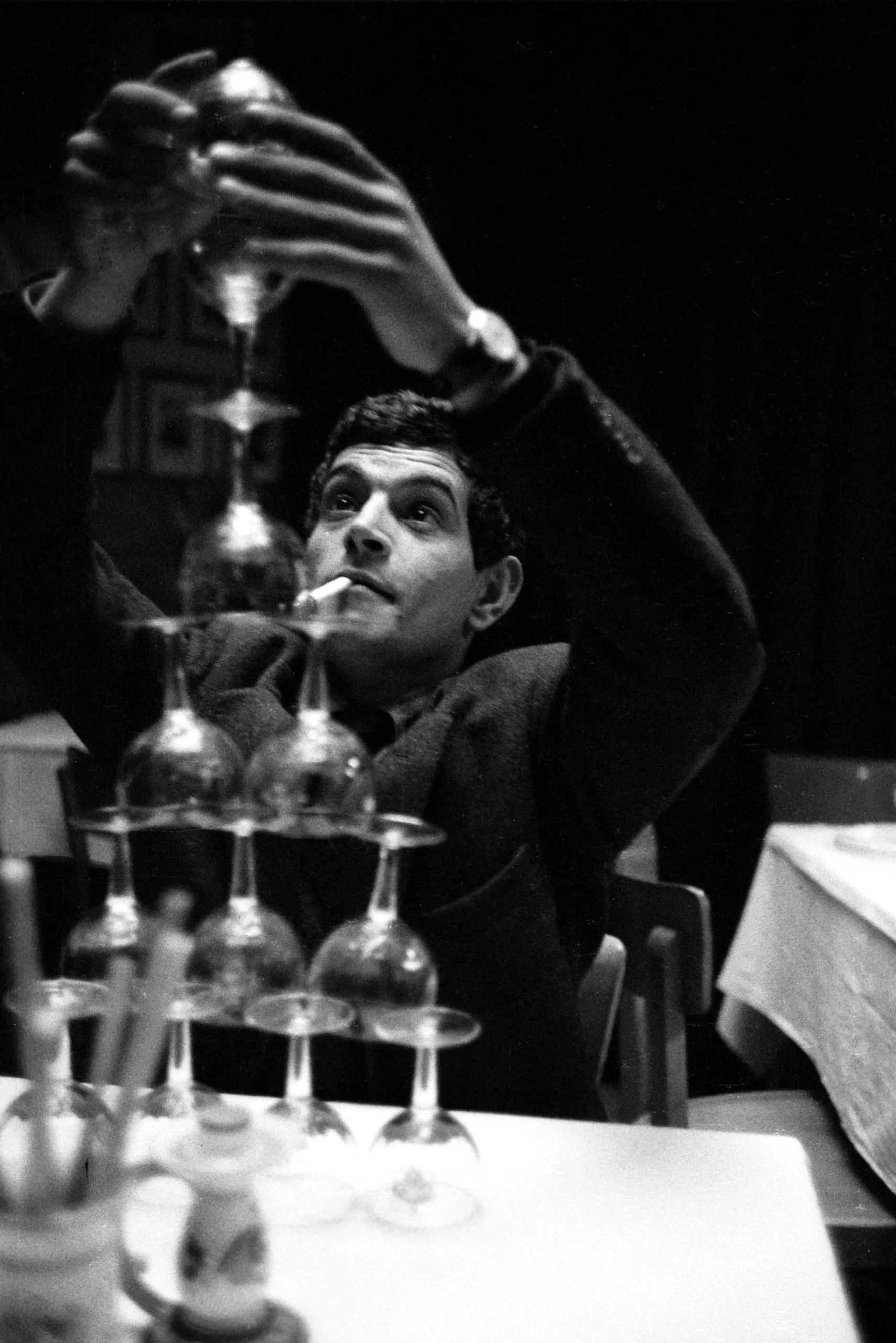 Black and white photograph of a young man seated at a table, cigarette in lips, reaching overhead to place a glass atop a pyramid of inverted stemmed glasses