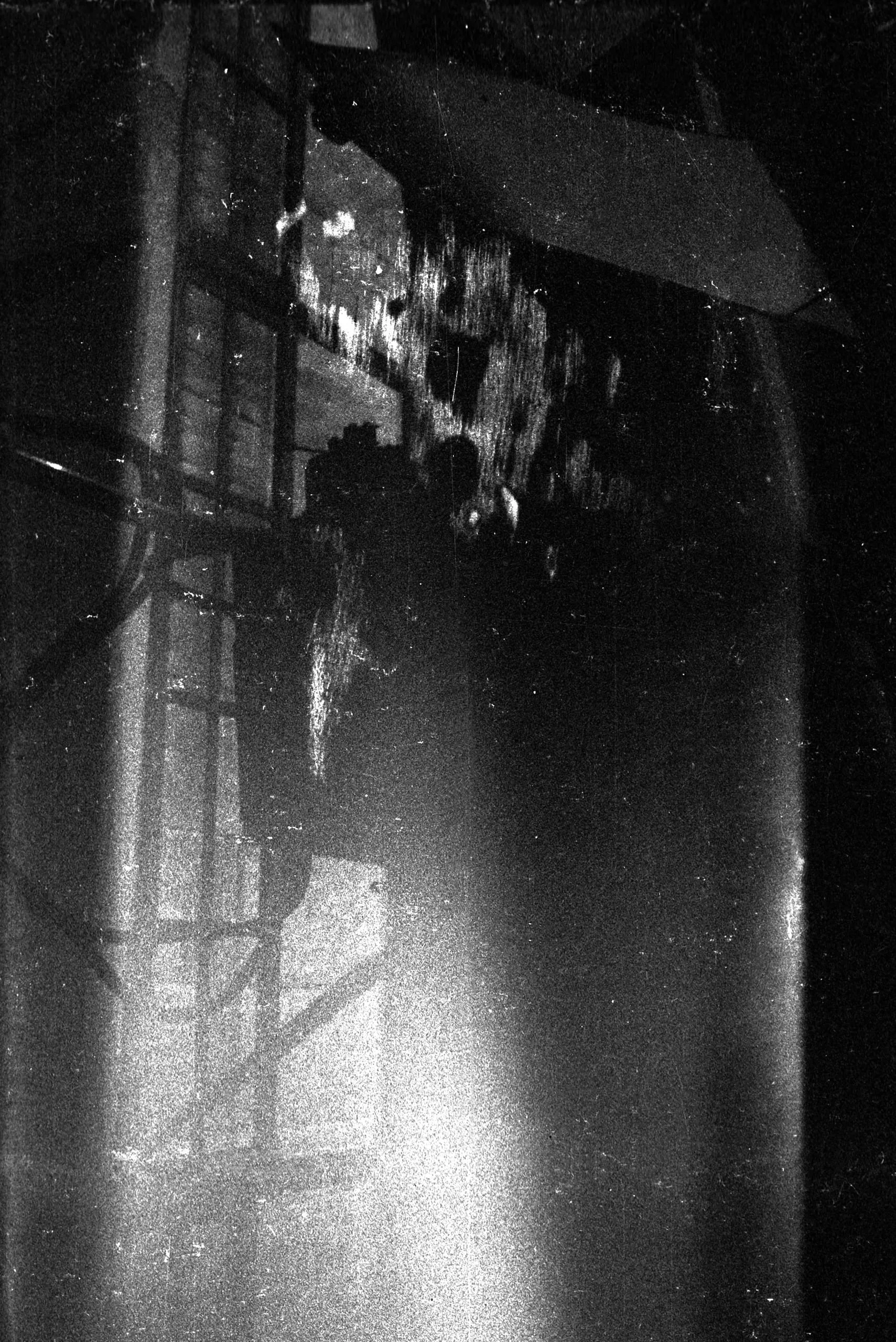 Grainy black and white photograph of a dimly lit industrial interior, with a ladder at left, two shadowy figures near the top center, and a diffuse wash of bright light filling the lower portion