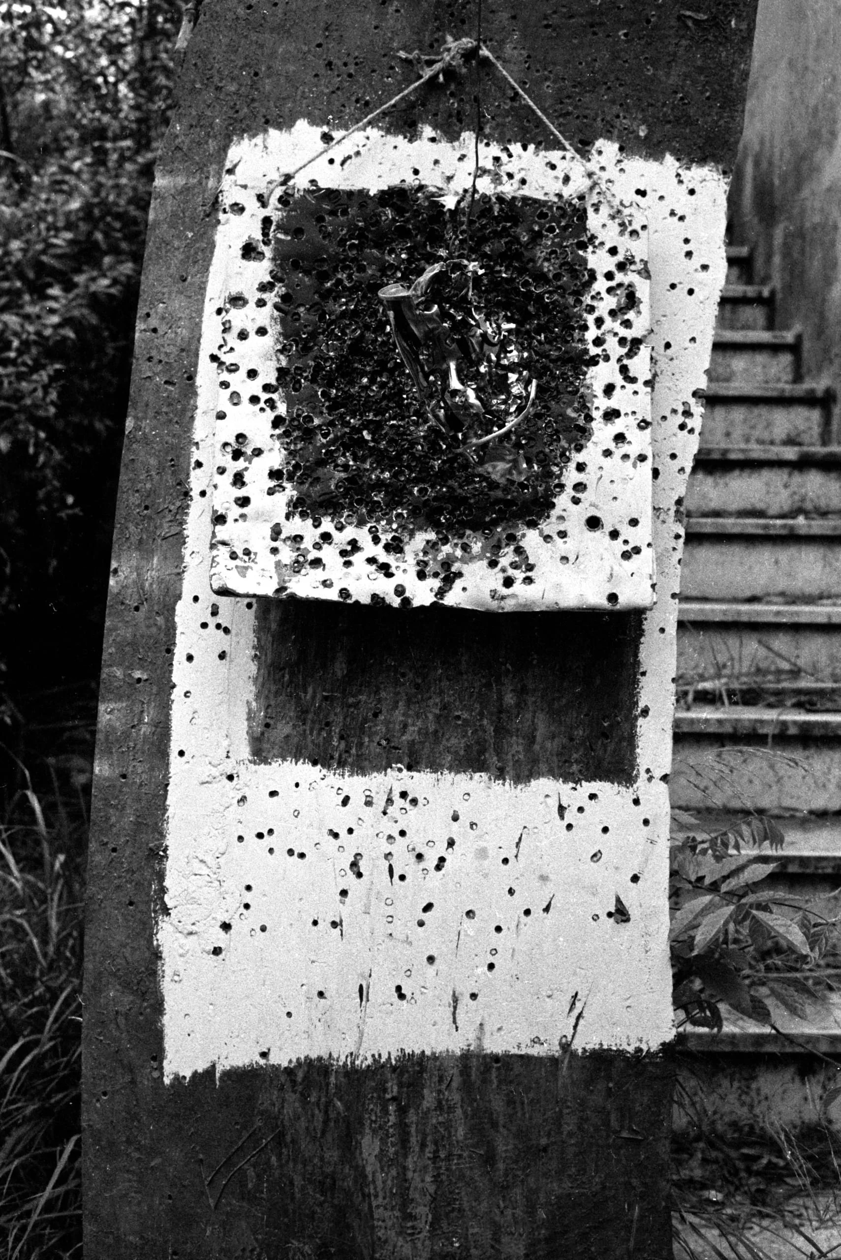 Black and white photograph of a bullet-scarred concrete column with a white-painted board attached, holding a wire-hung inner frame filled with twisted debris