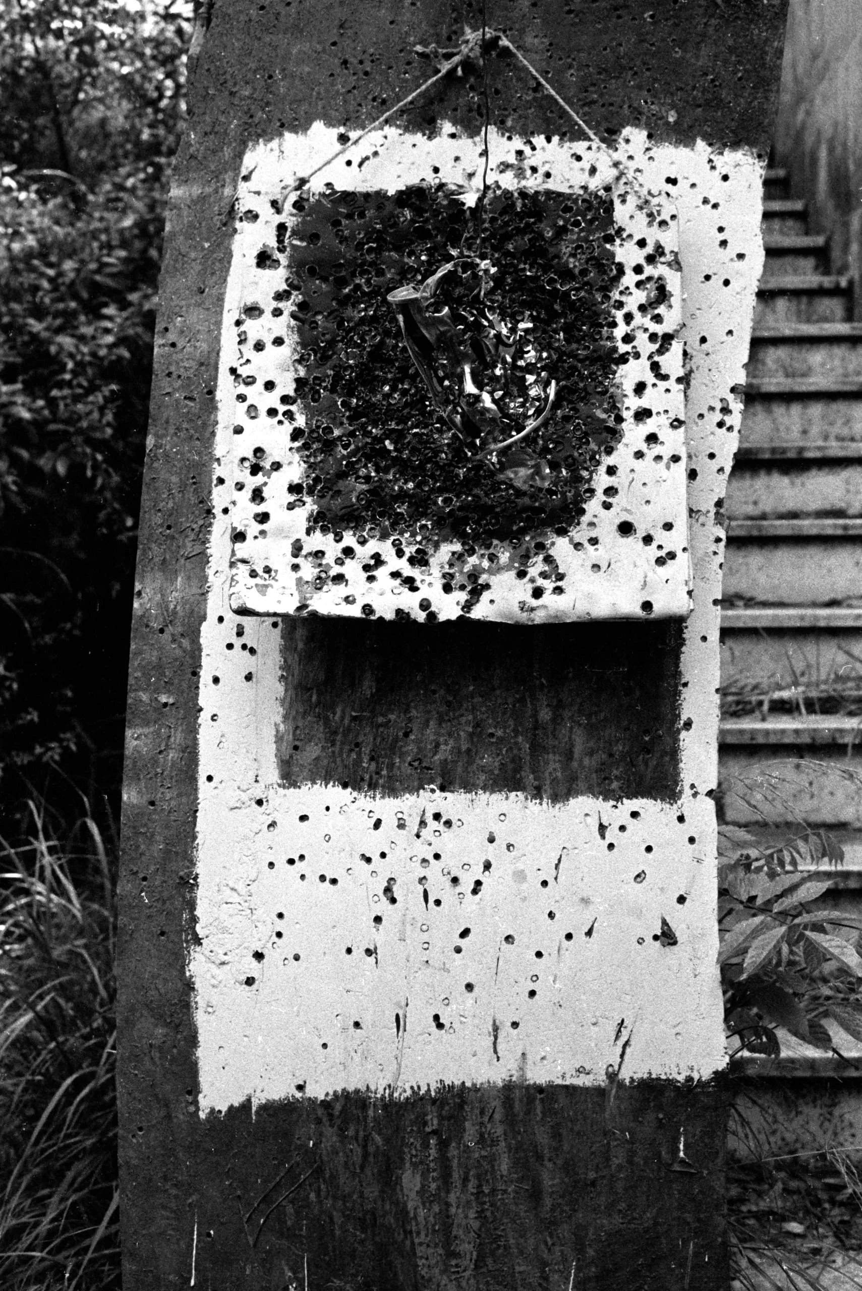 Black and white photograph of a white-painted concrete panel covered in dark pockmarks, hung on an outdoor pillar, with a cluster of tangled debris at its center