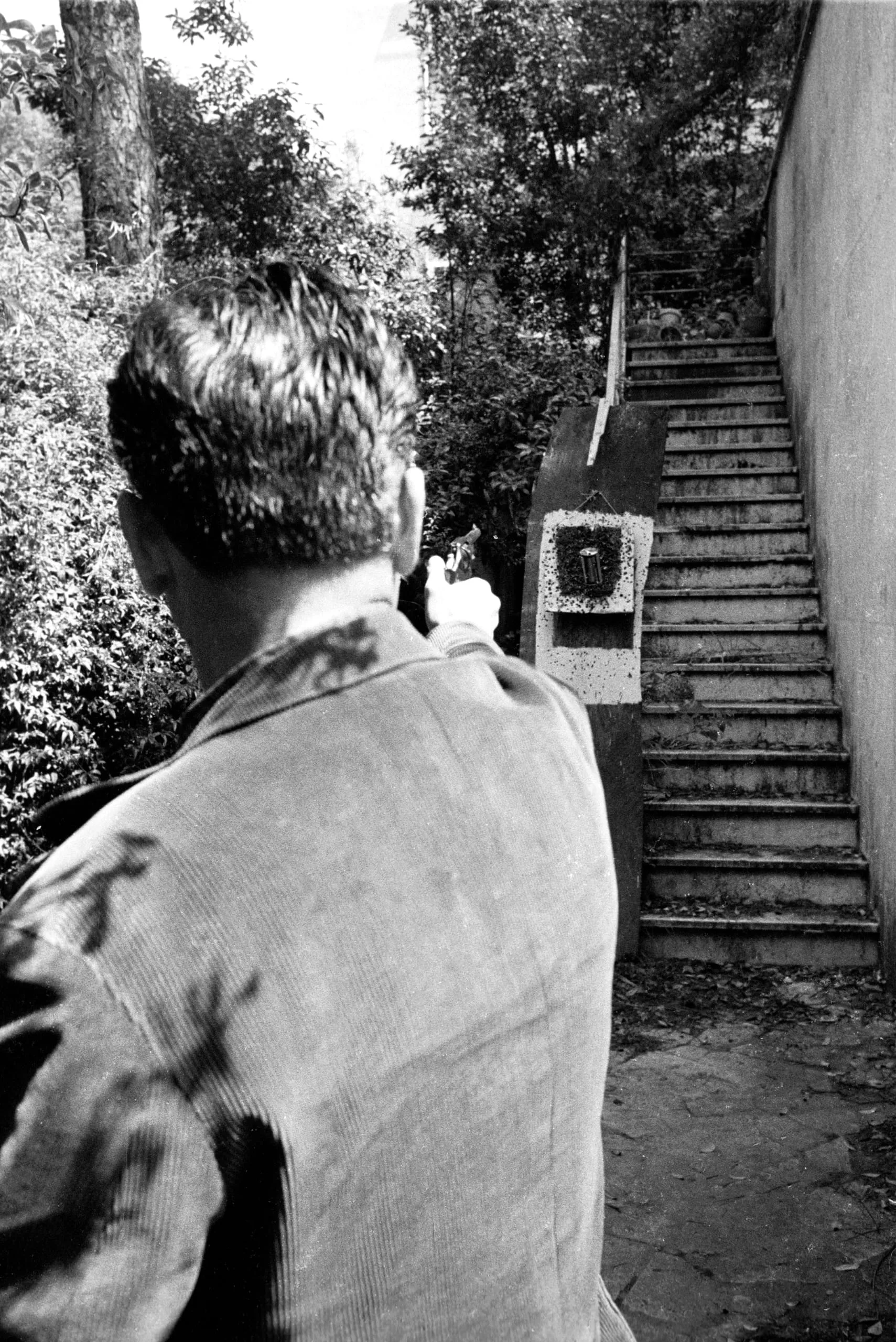 Black and white photograph, a man seen from behind aiming a handgun at a paper shooting target at the base of an outdoor concrete staircase